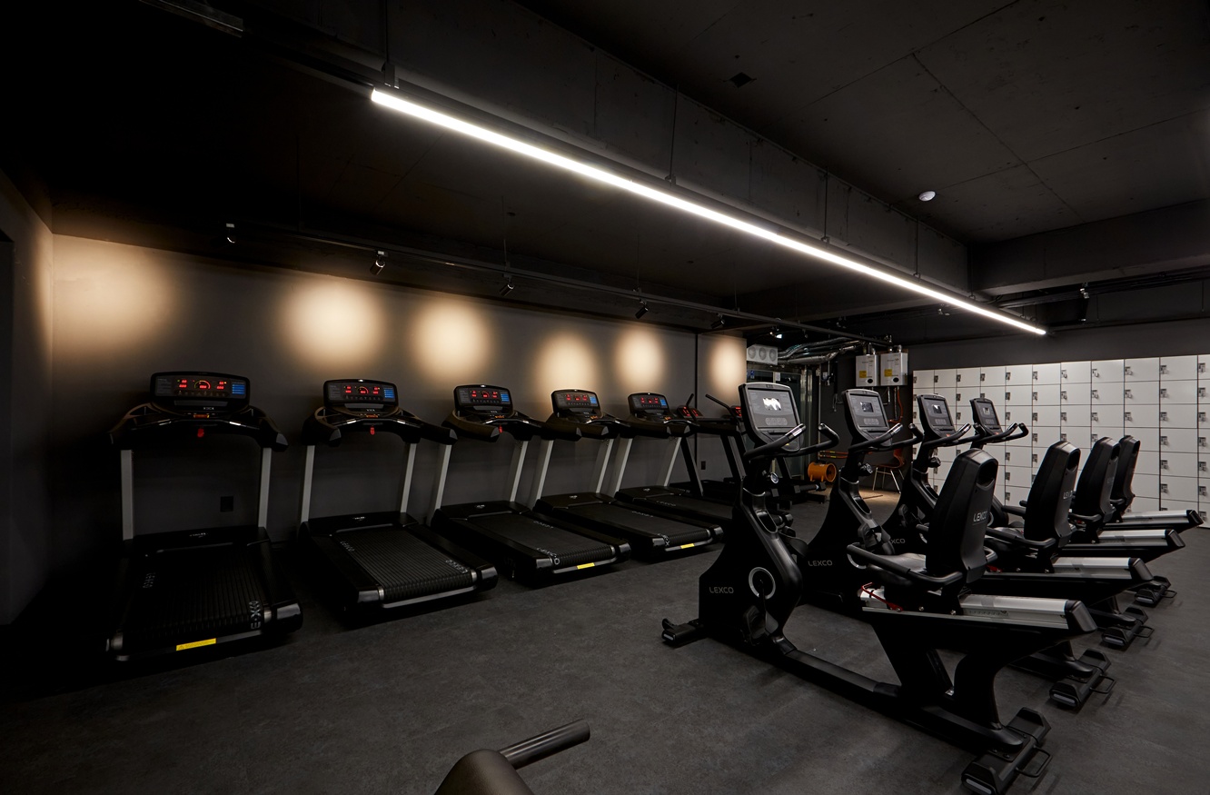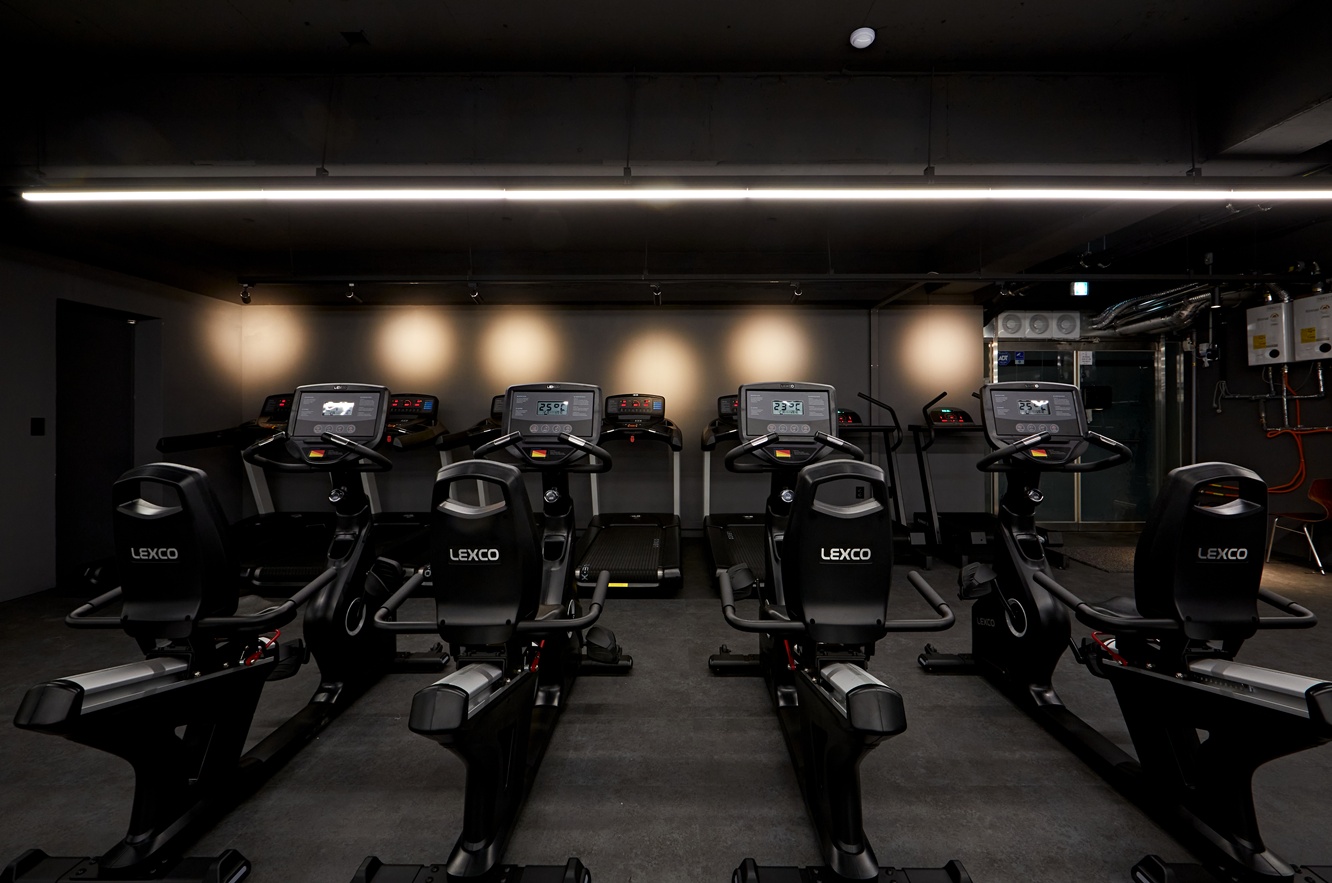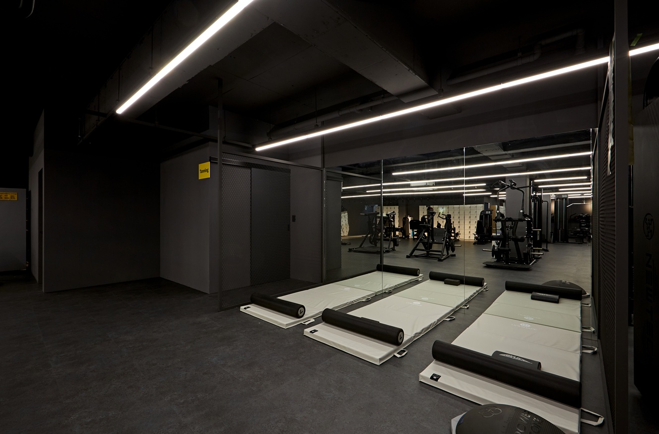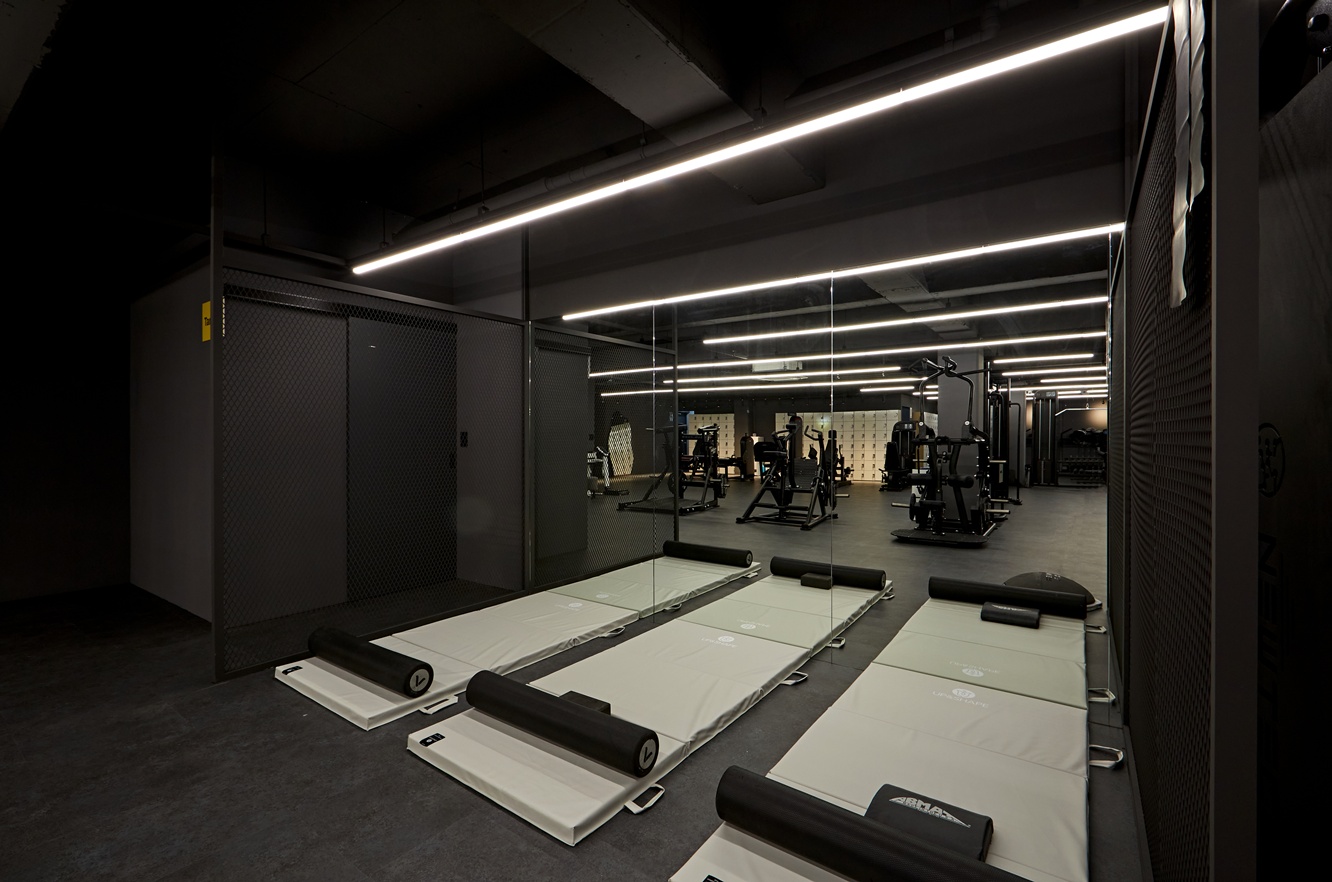 운동 기구는 블랙 컬러로 통일하여 공간에 일체감을 주었고, 사용자가 운동하는 동안 집중과 몰일감을 높이는 디자인이 되도록 하였습니다. 바닥 역시 어두운 톤으로 마감하여 시각적 안정감을 주면서도, 라인 조명을 적절히 활용해 공간의 깊이감과 세련됨을 극대화하였습니다.