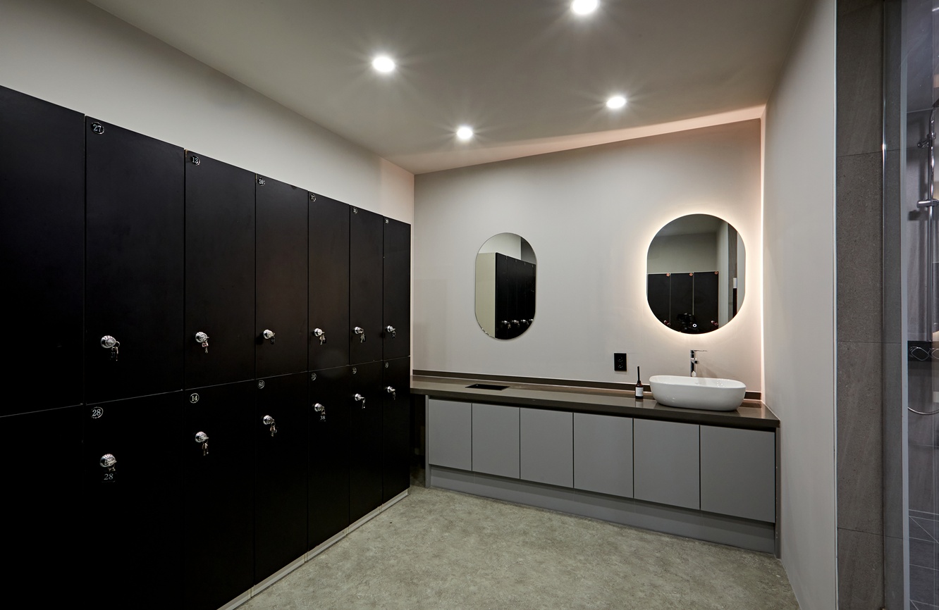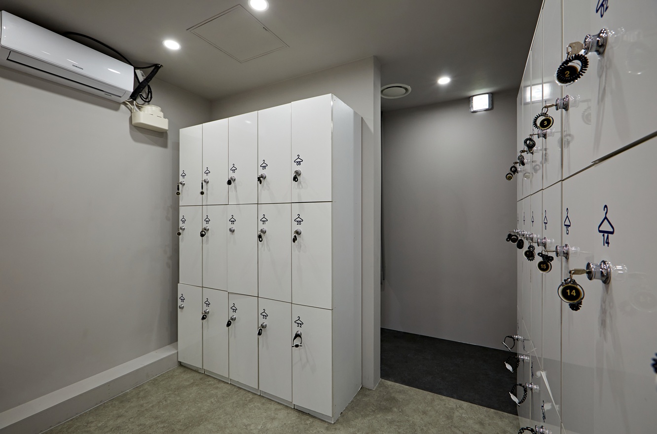 락커룸에는 화이트톤으로 설치하여 블랙톤의 공간에 확실한 포인트 효과를 주었으며, 샤워실 입구에 설치해 회원들의 편의까지 고려하여 설치하였습니다.