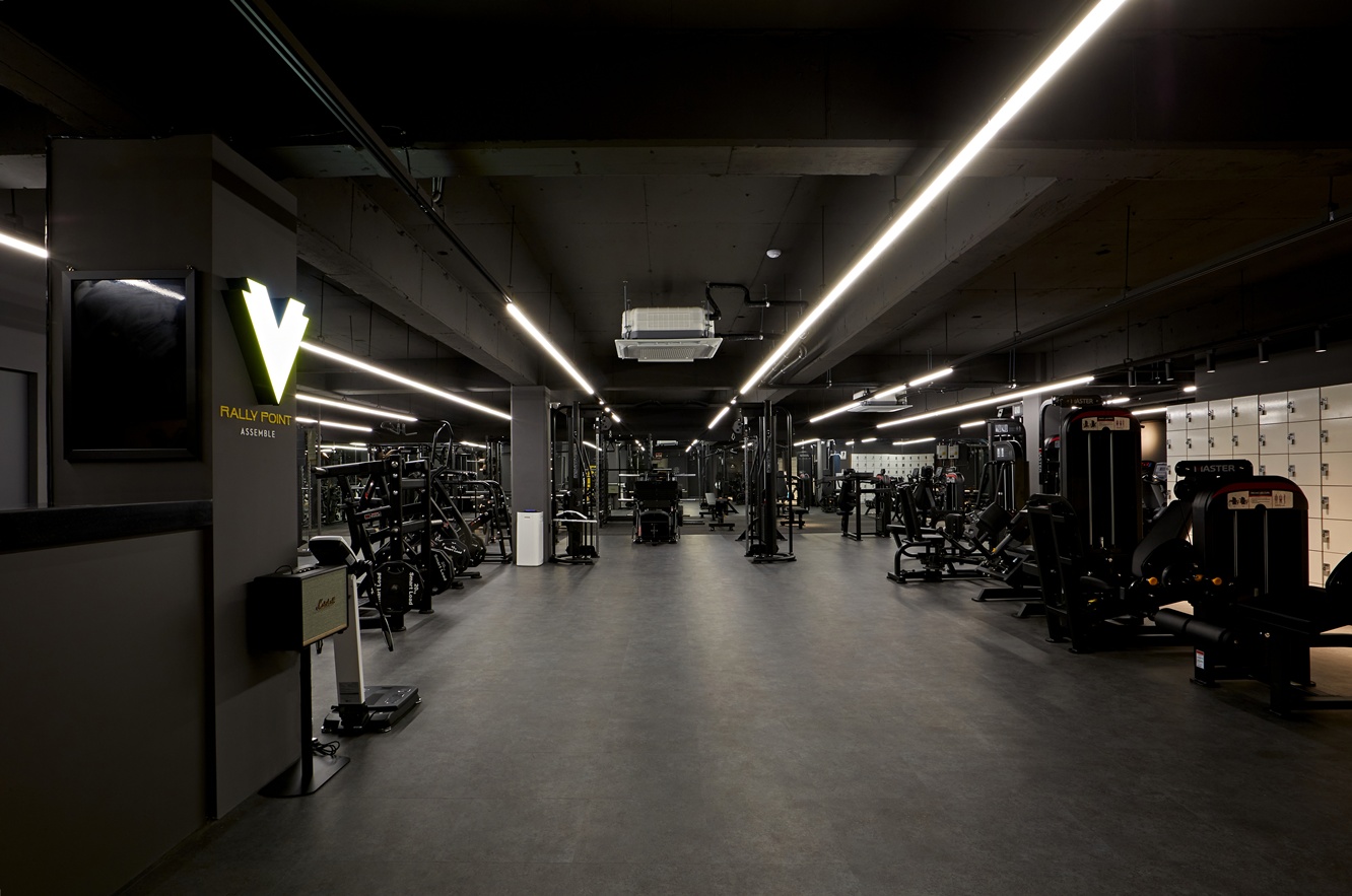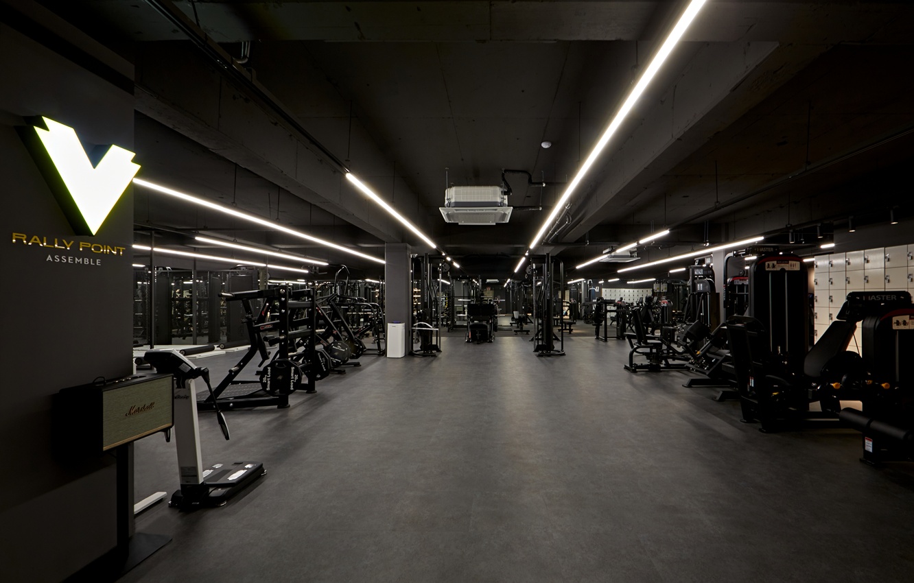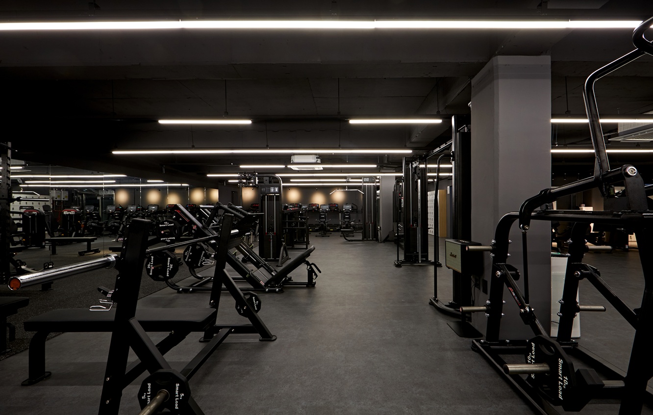 헬스장 천장에는 라인 조명과 포인트 조명을 적용하여 운동 공간이 단조롭지 않도록 연출하였습니다. 라인 조명은 운동 기구 사이사이게 길게 서리하여 공간의 연속성을 강조하고, 포인트 조명은 특정 구역이나 벽면, 기둥에 배치해 공간에 리듬감을 부여했습니다.