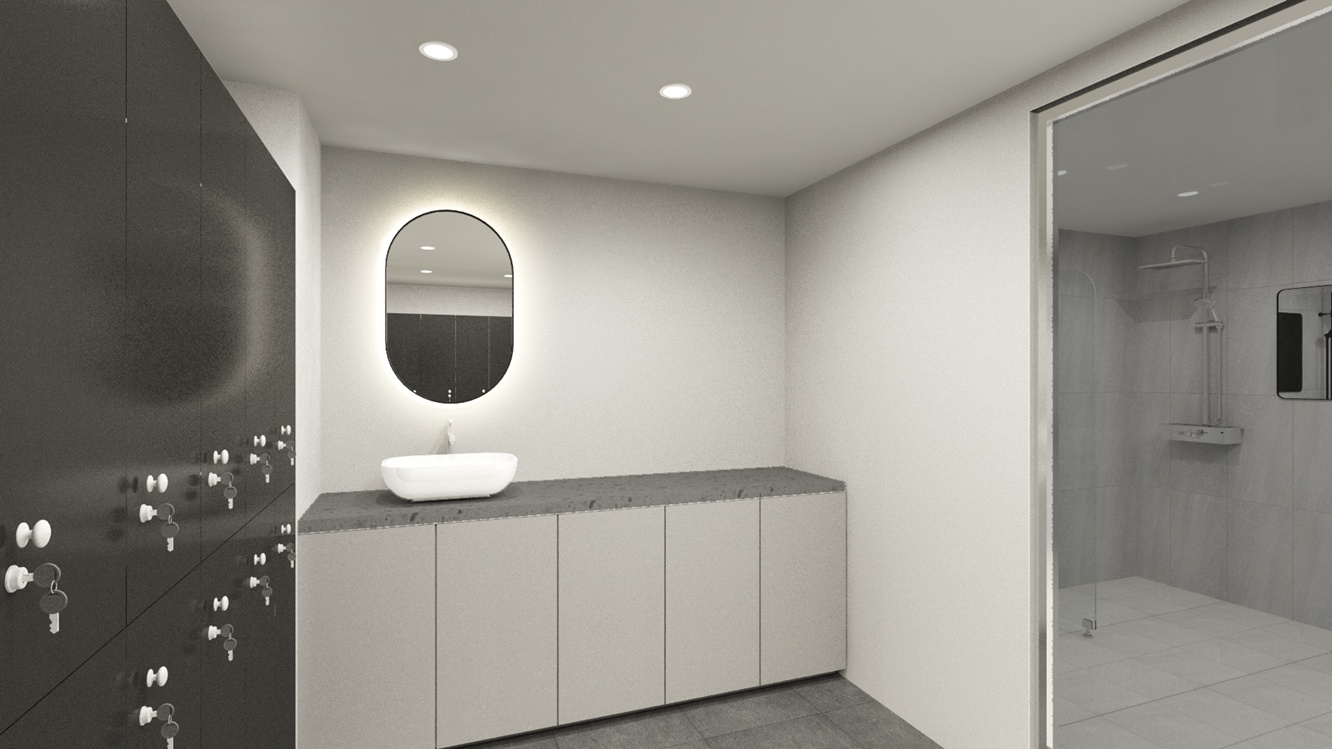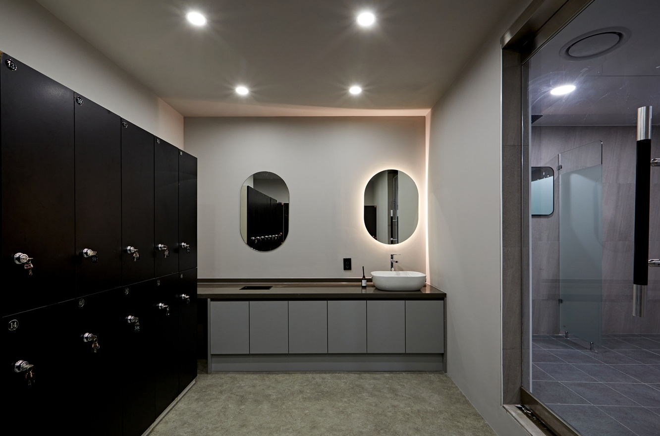 운동 후 이용하는 샤워룸과 락커룸 역시 전체적으로 어두운 톤을 유지하면서도, 그레이 컬러의 싱크대와 블랙 옷장을 활용해 실용적인 공간으로 구현하였습니다.