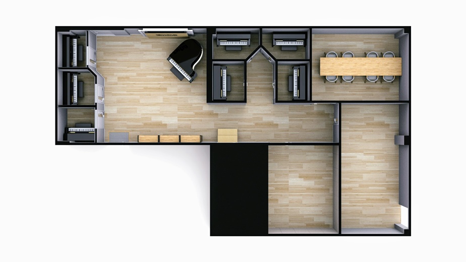 이번에 제안드린 현장은 총 8대의 피아노가 비치될 예정이고 그 중 그랜드 피아노는 로비에 두고 나머지 7대를 각 방에 들여 수업을 받을 수 있도록 조성했습니다. 1:1 레슨을 위한 방과 그룹 레슨을 위한 방을 구분했는데요, 그룹레슨을 위한 방은 클러스터형으로 배치하면 강사의 동선을 최소화하면서 시간을 효율적으로 활용할 수 있답니다.