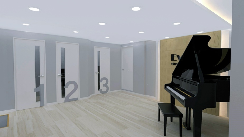 예를 든다면 각 레슨실은 다른 방에서의 소리가 들리지 않도록 벽면은 물론 문까지도 방음이 완벽해야지만 그 외 원장실이나 상담실 등은 그보다는 낮아도 되기 때문에 이를 반영하는 것이죠.