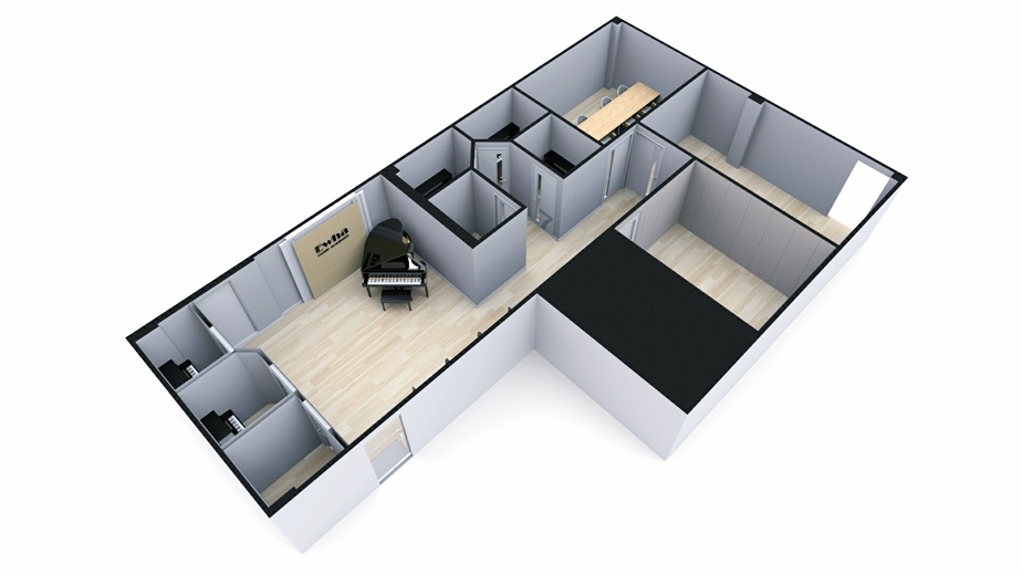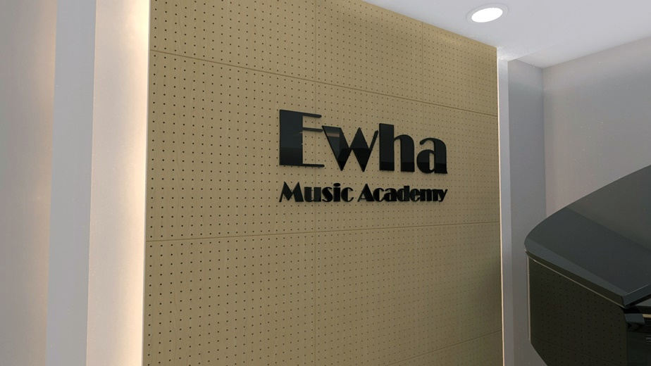 아트월은 우드톤의 타공판을 적용해 우드 바닥과 조화되면서 연그레이 디자인과 밸런스를 맞췄는데요, 아트월에 학원 을 블랙컬러의 깔끔한 폰트로 디자인해 붙이면 분명한 대비를 이루면서 모던한 느낌을 극대화할 수 있습니다. 3D 이미지이기는 하지만 딱 봤을 때 뉴욕이나 호주 어느 음악당의 미니홀 느낌이 나죠?