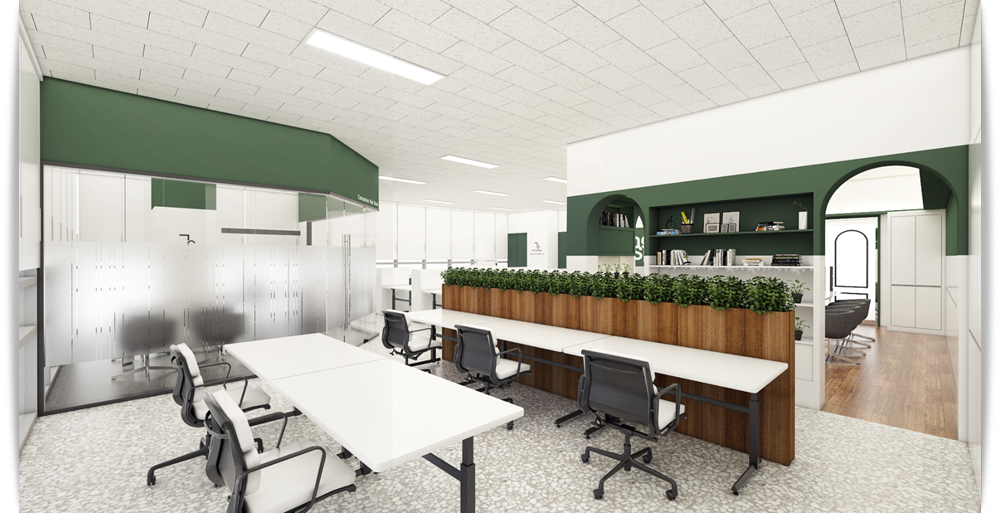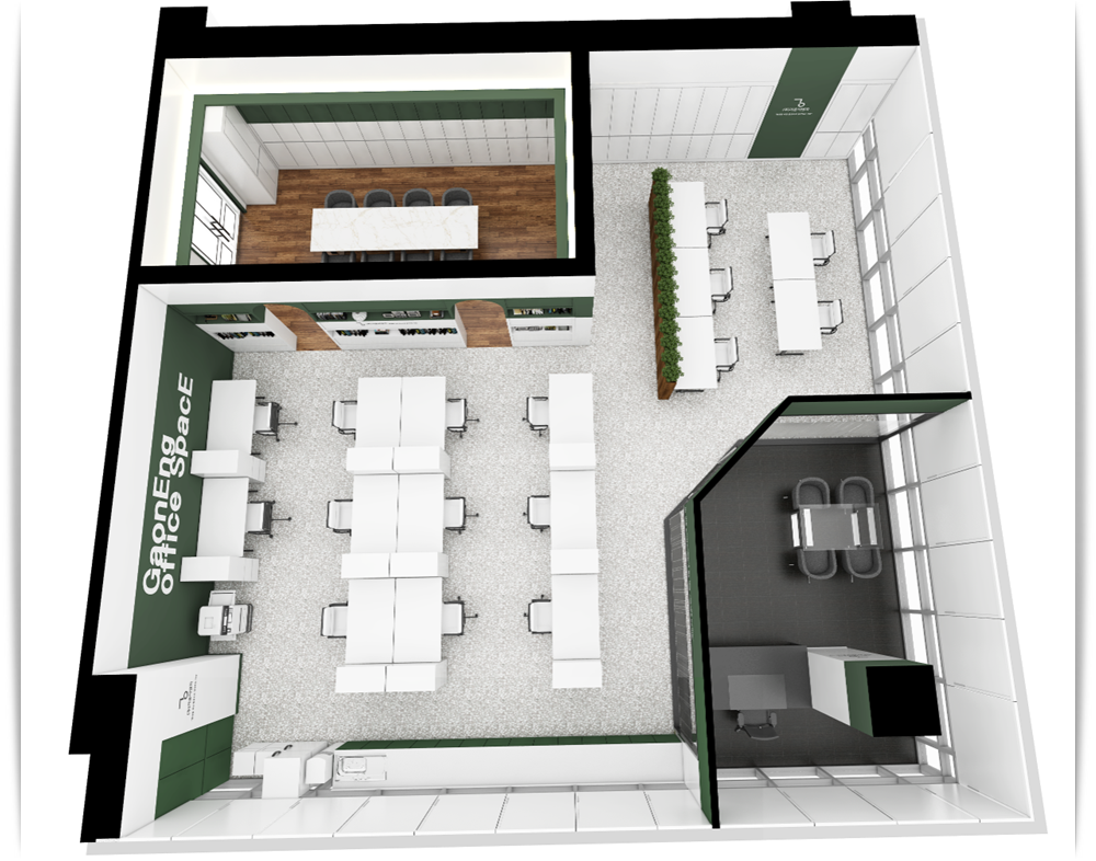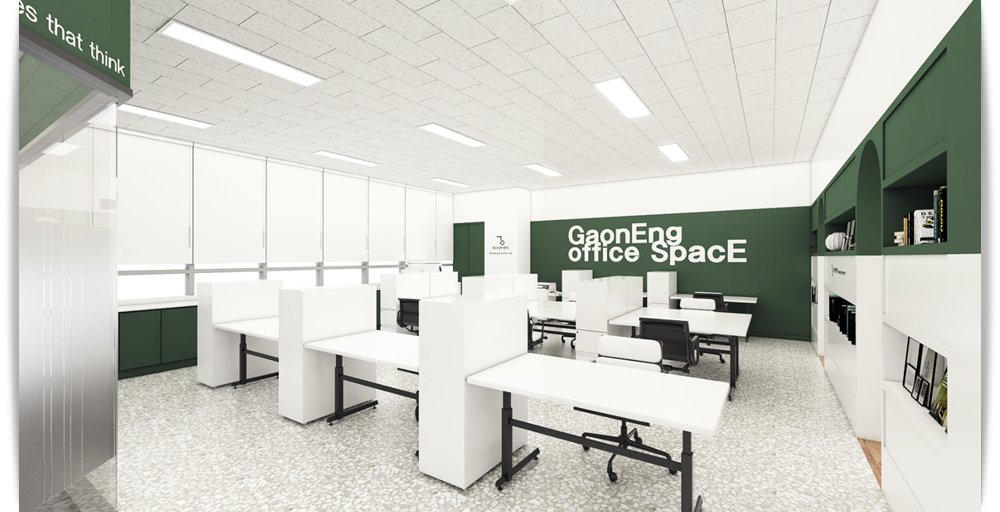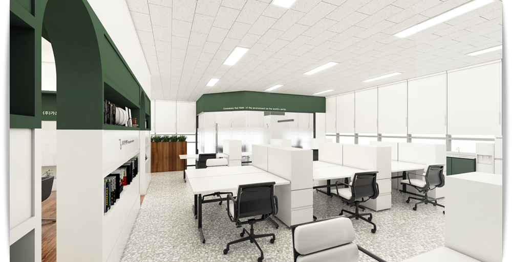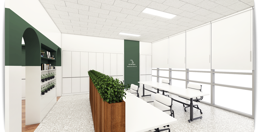회의실 뒤쪽에 위치하고 있는 공용 사무 공간은 더욱더 싱그러운 분위기를 보여주고 있습니다. 앞쪽 부분에 우드 컬러의 파티션을 설치하고 위쪽에 식물을 더하여 그린 컬러로 진행한 포인트 인테리어의 분위기를 더욱더 살려주고 있습니다. 옆쪽에는 개별 사무공간이 위치하고 있지만 불투명하여 서로의 프라이버시를 지켜주는 인테리어로 완성되었습니다.