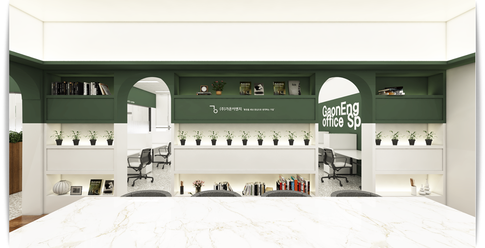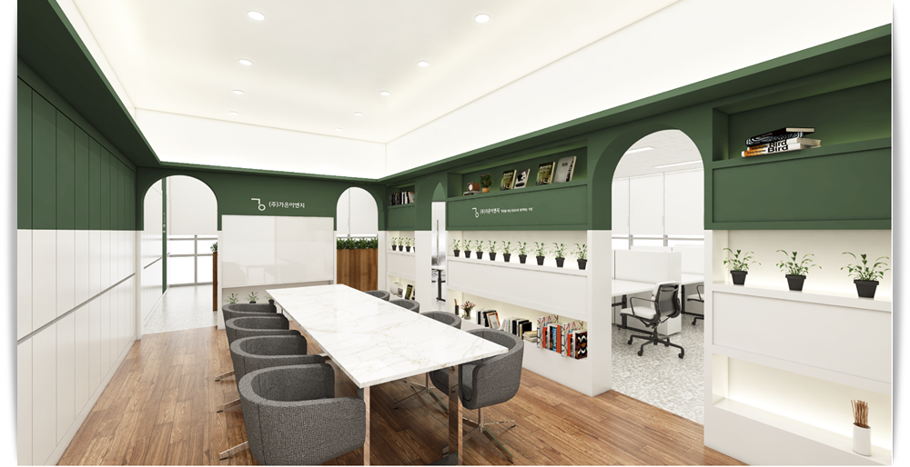 다음으로 만나 보실 공간은 회의실입니다. 입구를 아치형 형태로 디자인하여 설계해 드렸으며 입구 벽면에는 오픈 수납장을 설치하여 실용적이면서 인테리어 측면을 높일 수 있도록 디자인해드렸습니다. 거기에 위쪽 부분에 이번 현장의 포인트 컬러라고 할 수 있는 그린 컬러를 넣어 매력을 더해주고 있습니다.