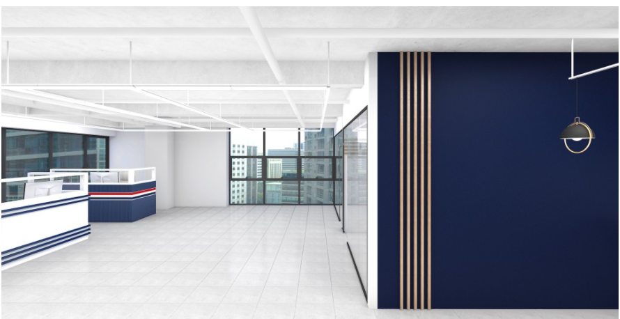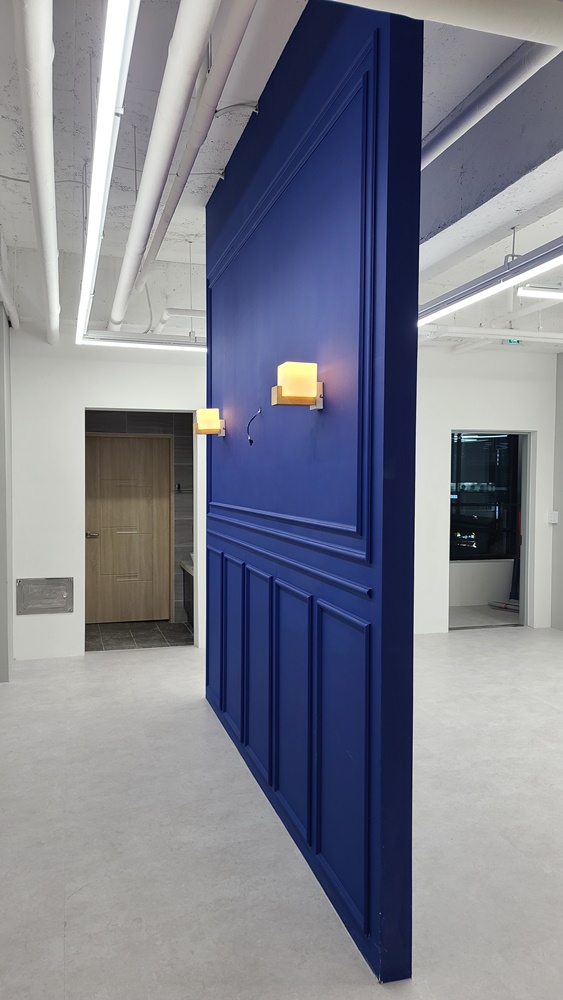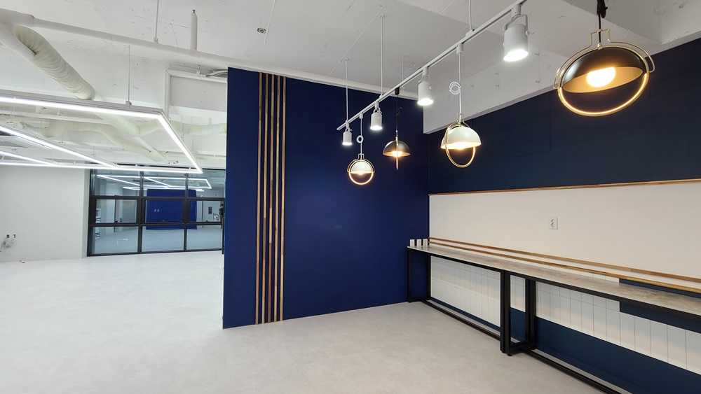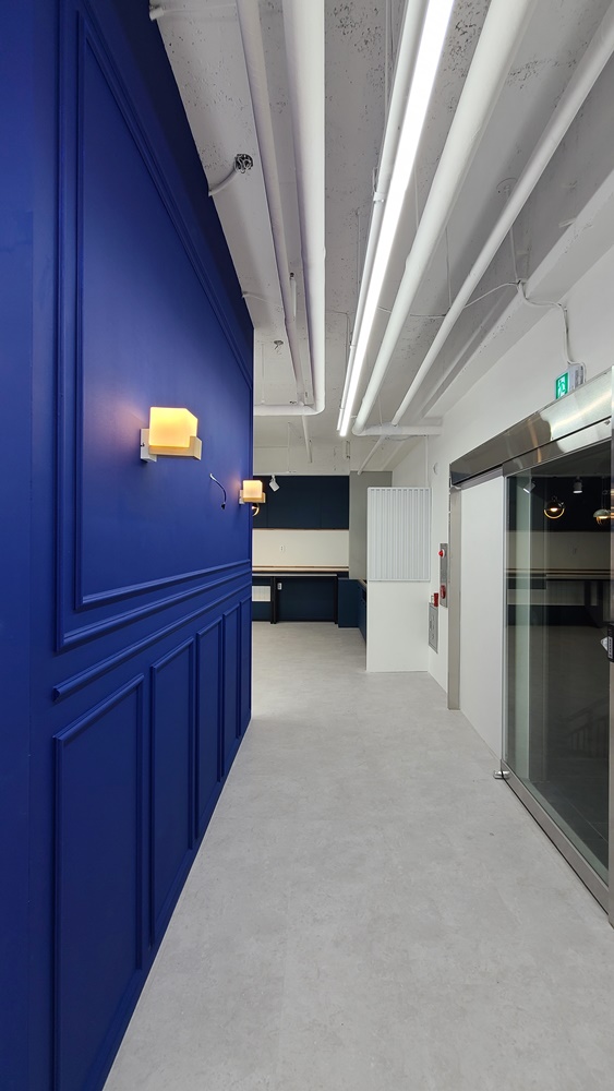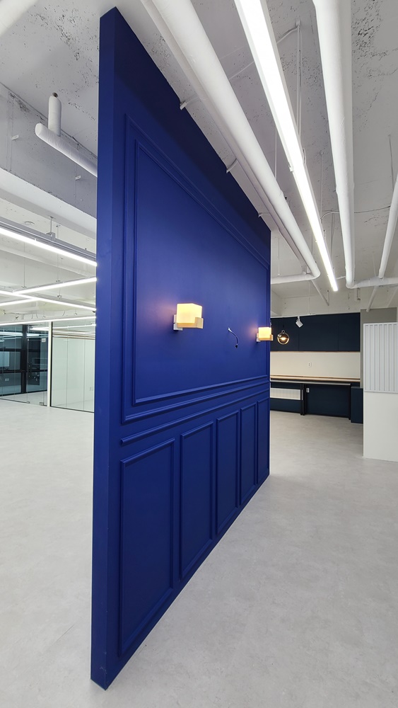사무실 내부 파사드입니다. 네이비 컬러로 내부 이미지월을 세웠으며 웨인스코팅으로 마무리하고 벽부등을 시공해 고급스러움을 한껏 끌어올렸습니다. 시공 후 안전성을 확보하기 위해 바닥과 천장에 반영구적으로 고정을 시켰고 천장에서 배선을 따 조명을 시공함으로써 깔끔하게 마무리될 수 있었습니다. 전체적으로 노출 천장을 그대로 활용해 독특한 조명 연출을 완성할 수 있었는데요,