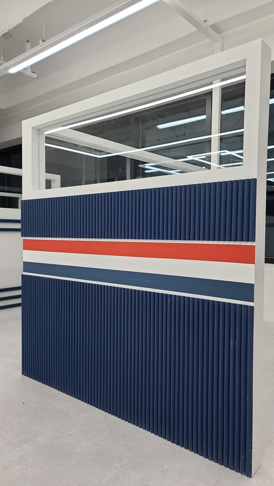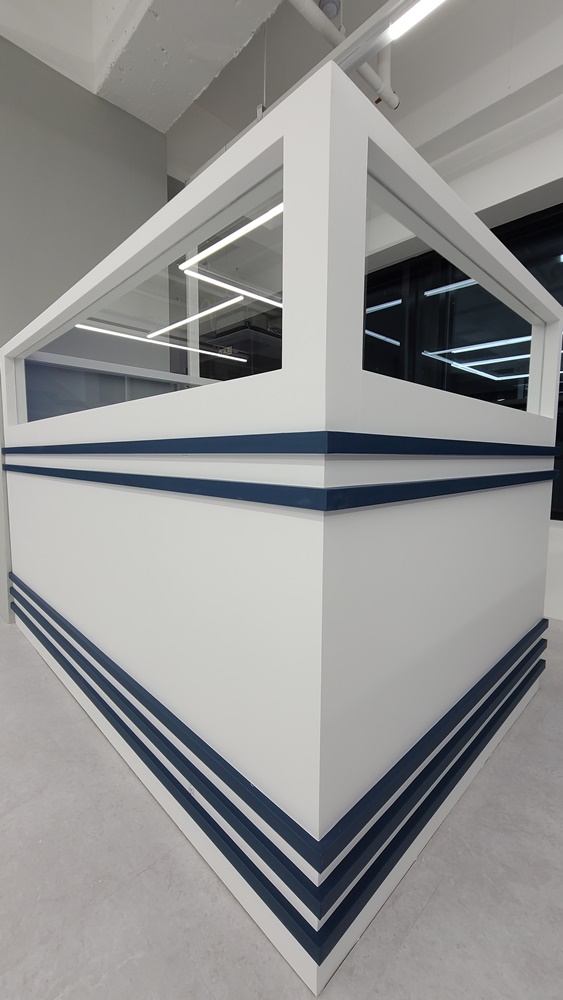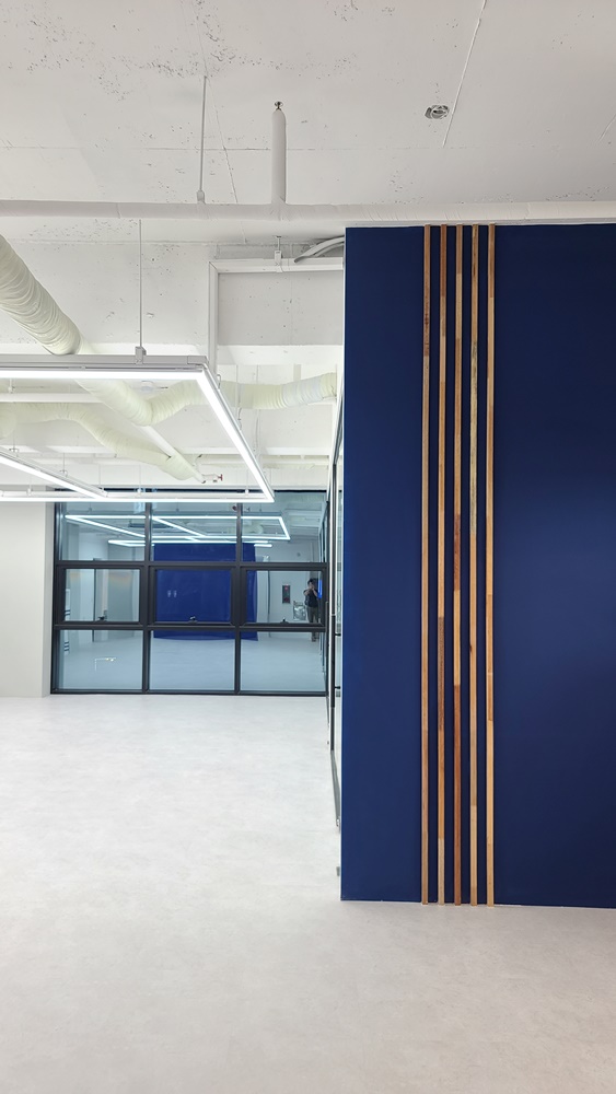 카페테리아 공간과 개별 공간을 구분하는 가벽은 디자인 월로 시공하고 내부 파사드에 적용한 네이비 컬러로 마감하고 간살 디자인을 적용했습니다.