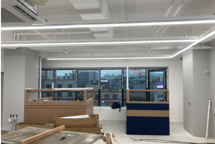파티션의 상단부는 유리로 제작해 개방감을 확보했고 하단부는 템바보드와 라인 디자인을 적용해 세련된 이미지를 구현했습니다. 파티션으로 공간분리 작업을 한 후에는 그에 맞는 조명을 연출해줘야 업무 효율을 높일 수 있는데요, 이 역시 전문 디자이너의 설계가 필요한 부분이므로 지식산업센터 인테리어를 하실 때는 전문업체에 의뢰해 전문적이 시공을 진행하는 것이 좋습니다.