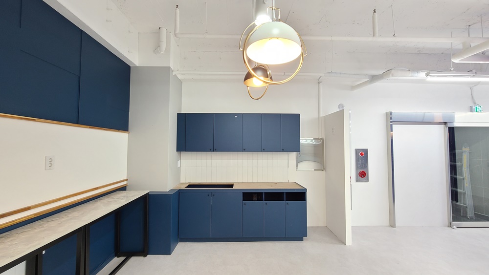 오른쪽 방문객 동선을 따라 들어오면 바로 탕비실을 만날 수 있습니다. 최근 탕비실은 직원의 복지를 위해 카페테리아로 조성하는 곳이 많아졌는데요, 캐주얼한 분위기의 카페테리아는 회사의 이미지를 좋게 만들어주기도 하므로 일석이조의 효과를 노릴 수 있습니다. 물론, 카페테리아는 회사의 이미지만을 위해 만들어진 곳이 아니므로 저희 916디자인은 직원들의 사용성과 편의성을 높이기 위해 디자인, 기능, 조명 등을 활용해 멋진 공간으로 연출해드리고 있습니다.