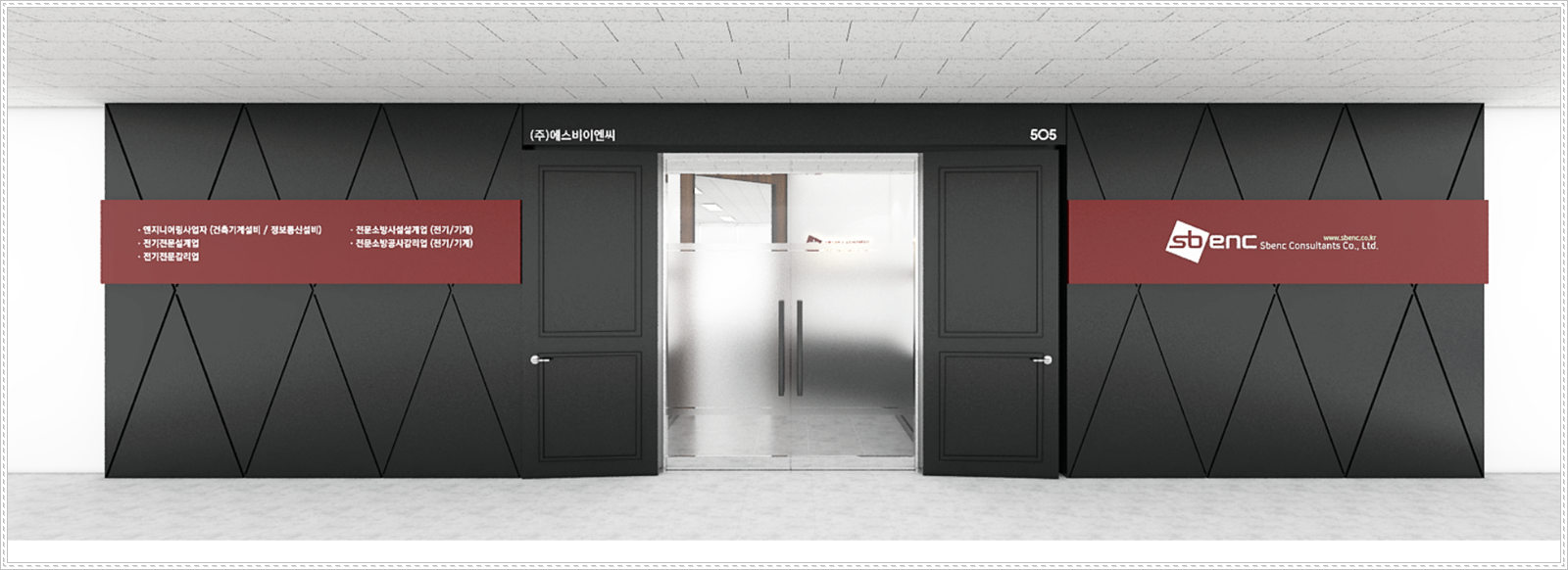 회사 사무실 입구 모습입니다. 그레이 컬러로 모던하게 디자인하였으며 밋밋하지 않도록 무늬를 넣어 설계하였습니다. 거기에 붉은 컬러의 프레임을 가운데 더하여주고 회사 로고와 네이밍을 넣어 포인트를 주었습니다. 전체적으로 심플 모던한 회사 외부 모습을 보여주면서 고급스럽고 멋진 느낌을 보여주고 있습니다.