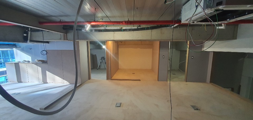 복층 공간은 기존의 배선, 배관, 공조시스템, 소방설비를 점검하고 정리한 후 오픈된 노출천장으로 시공했습니다. 노출 천장은 그만큼의 층고를 확보할 수 있기 때문에 좀 더 넓어 보이고 쾌적한 환경을 조성할 수 있어 주거, 상업, 사무 공간에 많이 활용되고 있는데요, 특별한 치장 없이도 트렌디하고 빈티지한 인테리어 효과도 있어 일석이조의 효과를 기대할 수 있습니다.