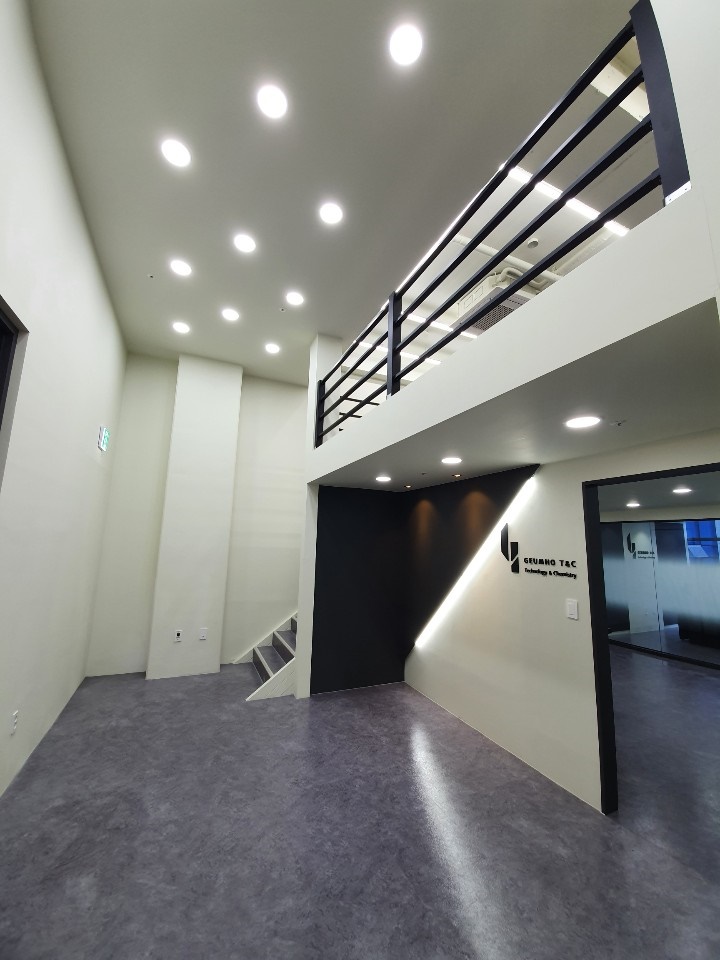 하부에는 출입문이 인접한 대표실 공간과 회의실 공간을 배치해 업무 효율성을 높였고 방문객의 동선을 제한했습니다. 조명은 매입형으로 계획해 층고를 최대한 확보하면서 깔끔하게 시공해 공간을 넓어 보이는 효과를 줬고 안개시트지가 시공된 유리 가벽을 설치해 개방성과 독립성을 확보했습니다.