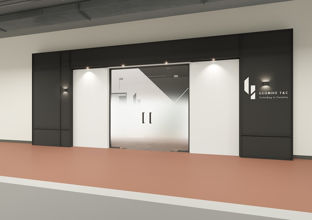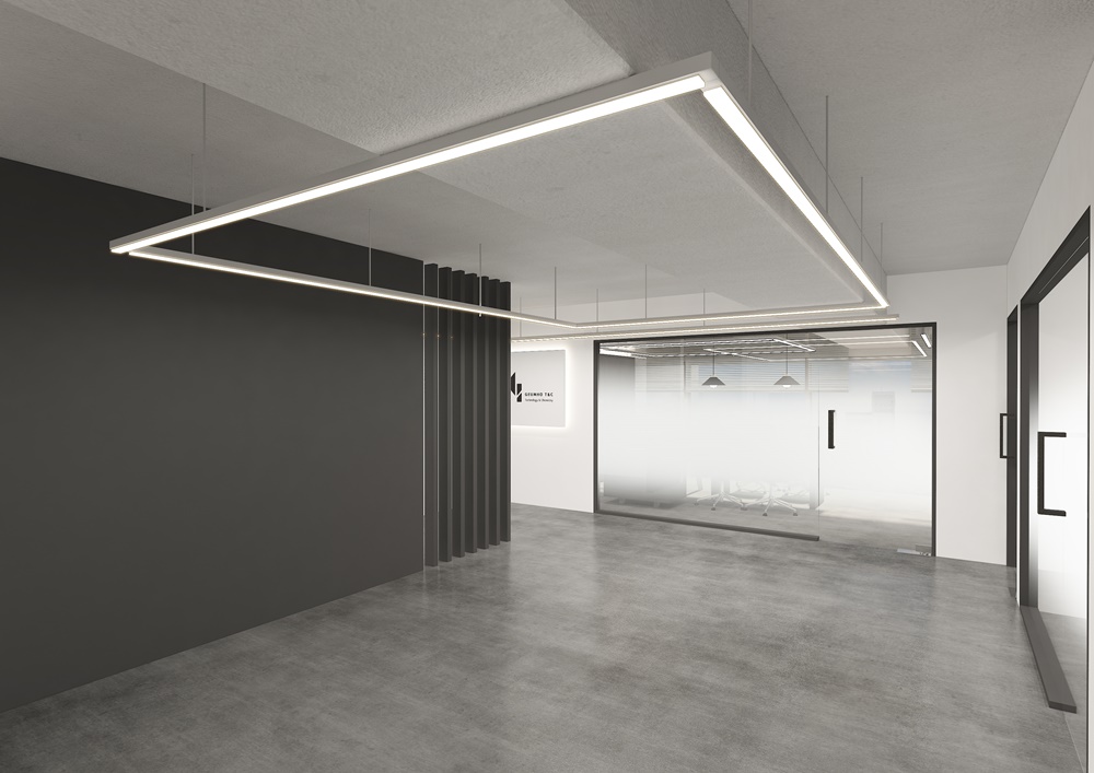 외부 입구 파사드입니다. 블랙, 그레이, 화이트를 기반으로 한 디자인으로 문은 필름지로 마감을 진행했고 파사드 부분은 목공으로 진행해 블랙 도장으로 마감했으며 회사명과 로고는 화이트로 제작해 벽부등으로 강조했습니다. 강화문 안의 도어는 안개 시트지를 시공한 유리로 제작해 내부 모습이 보이도록 함으로써 회사에 대한 호기심을 자극하는 효과를 노렸습니다.