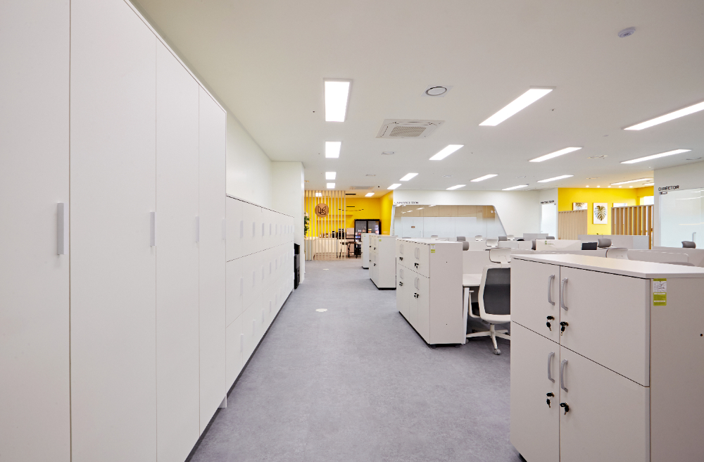 그리고 실제로 직장에서 근무해보신 분들은 아시겠지만, 생각보다 캐비넷이 많이 필요한 곳이 바로 회사이기도 합니다. 그래서 각자의 자리마다 개인 사물함을 비치해두는것은 물론 한쪽 벽면 전체를 서랍장으로 채웠습니다.