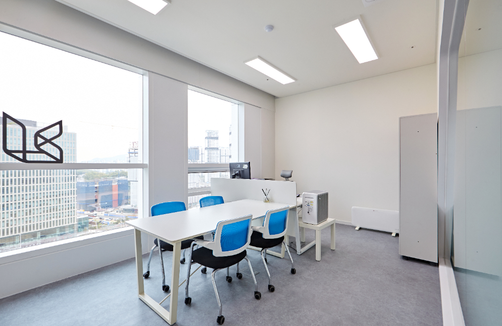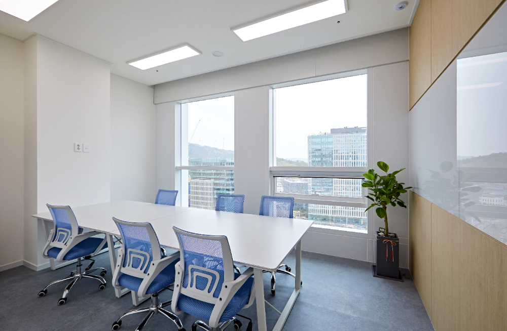 소회의실은 광명 티아모 it타워 사무실인테리어에서 가장 심플한 공간이 아닐까 싶습니다. 작아서 답답할 수 있기 때문에 대회의실과는 다르게 의자 컬러를 밝은색으로 채택하였고, 통창의 매력이 드러나도록 블라인드나 커튼을 설치하지 않은 채 두었습니다.