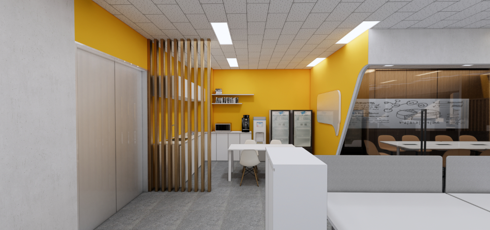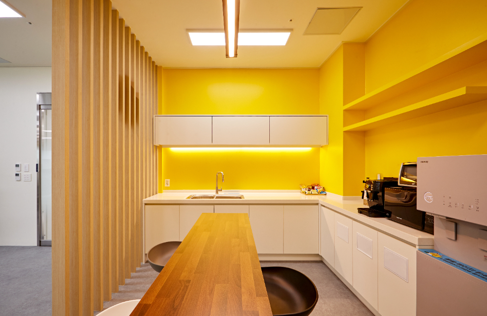 아까 잠깐 훑고 지나갔던 광명 티아모 it타워 사무실인테리어의 휴게실을 다시 한번 살펴볼까요? 앞서 말씀드렸듯이 업무공간이 아닌 곳은 노란색 컬러로 포인트를 주었는데요. 이곳도 귀여운 병아리가 연상되는 노란색 컬러로 벽면을 도장했습니다. 그리고 상부장은 천장과 거리를 두어 개방감을 높였으며 하부장은 ㄱ자로 구성하여 상판을 넓게 쓸 수 있도록 했습니다.