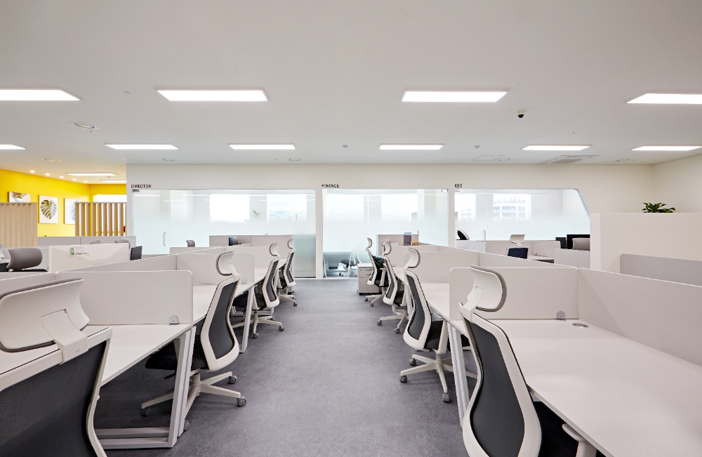 메인 사무공간은 한 눈에 보아도 정갈한 느낌이 가득한데요. 일정하게 배열된 공간 배치로 깔끔한 무드를 연출하였고, 모두 동일한 가구를 활용하여 비용적인 부분에서도 합리적인 절감을 이뤄냈습니다.