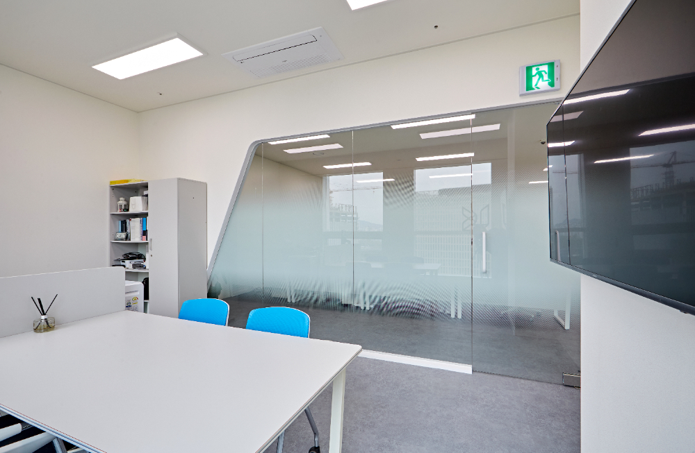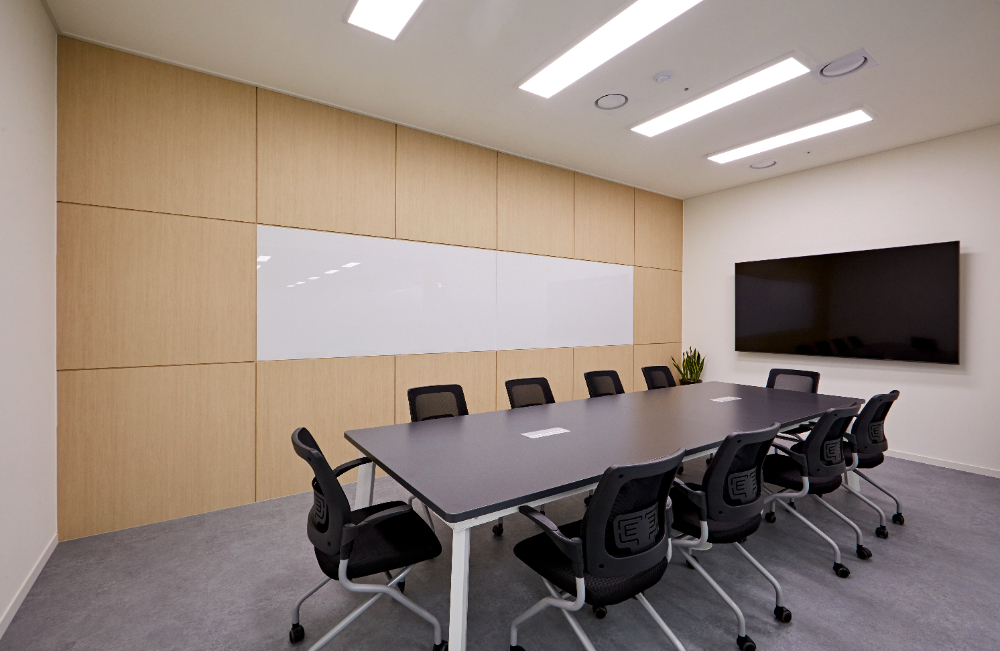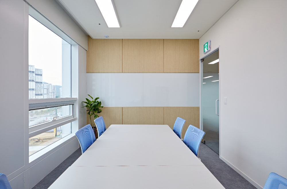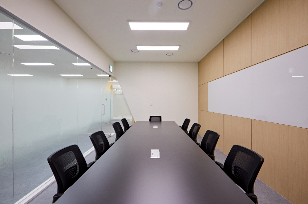 회의실은 심플하면서도 정숙할 수 있는 분위기로 시공했습니다. 내부는 별다를 것없이 원목으로 포인트를 준 벽에 화이트보드를 매립했습니다. 여기서 포인트는 바로 외벽인데요. 전체 유리로 벽면을 구성하면서 코너쪽에 사선 포인트를 주어 평범하지 않은 매력을 더했습니다.