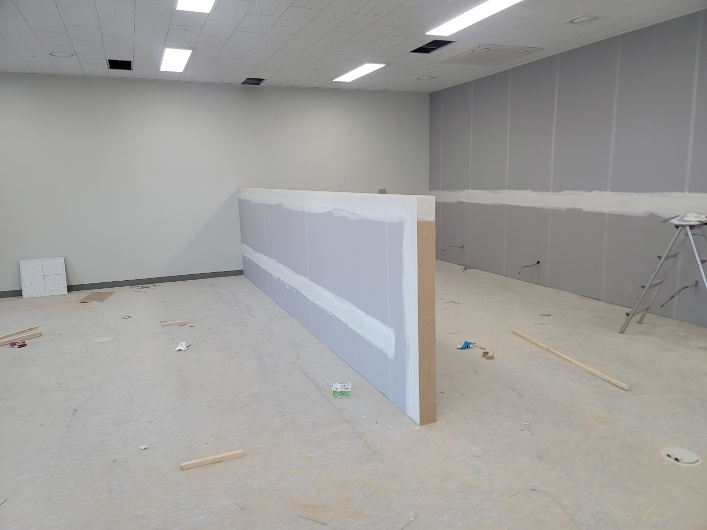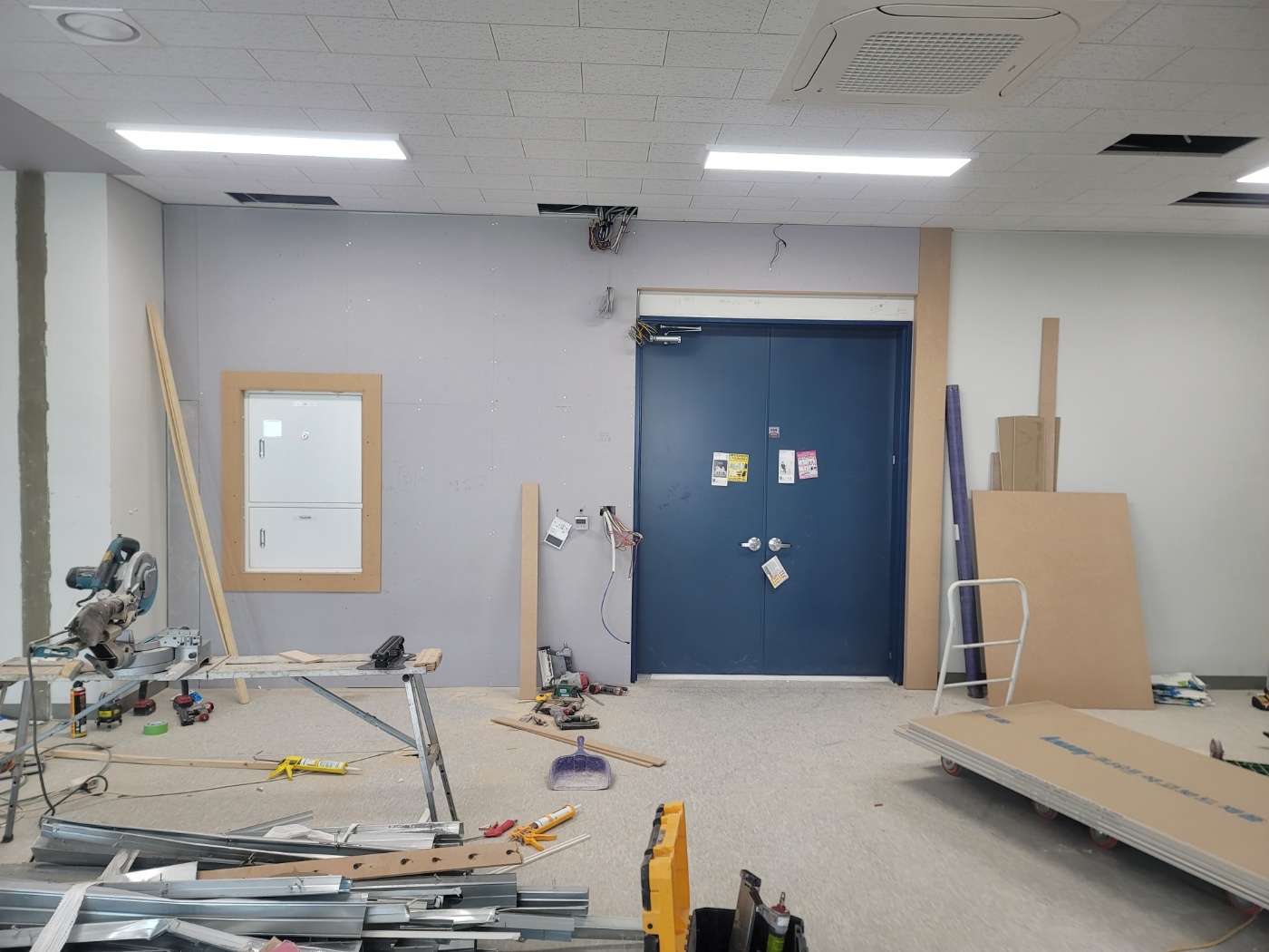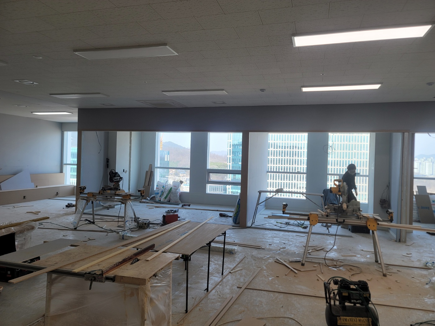 광명 티아모 it타워 사무실인테리어의 현장입니다. 특색있는 공간을 만들기 위해서 가벽도 단순한 모양이 아니라 사선이 들어간다거나 디테일이 필요한만큼 베테랑 기사들만이 모여서 팀을 구성하였는데요. 저희는 항상 높은 퀄리티를 위해서 단순한 일일 직원들이 아니라 오래도록 손발을 맞춰온 팀이 현장을 진두지휘하고 있습니다.
