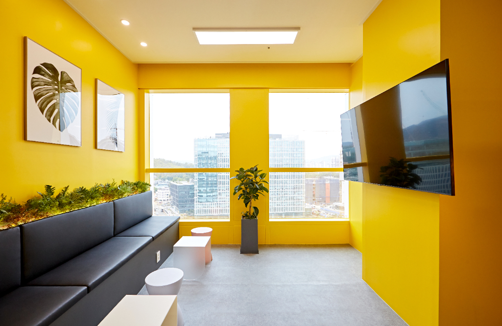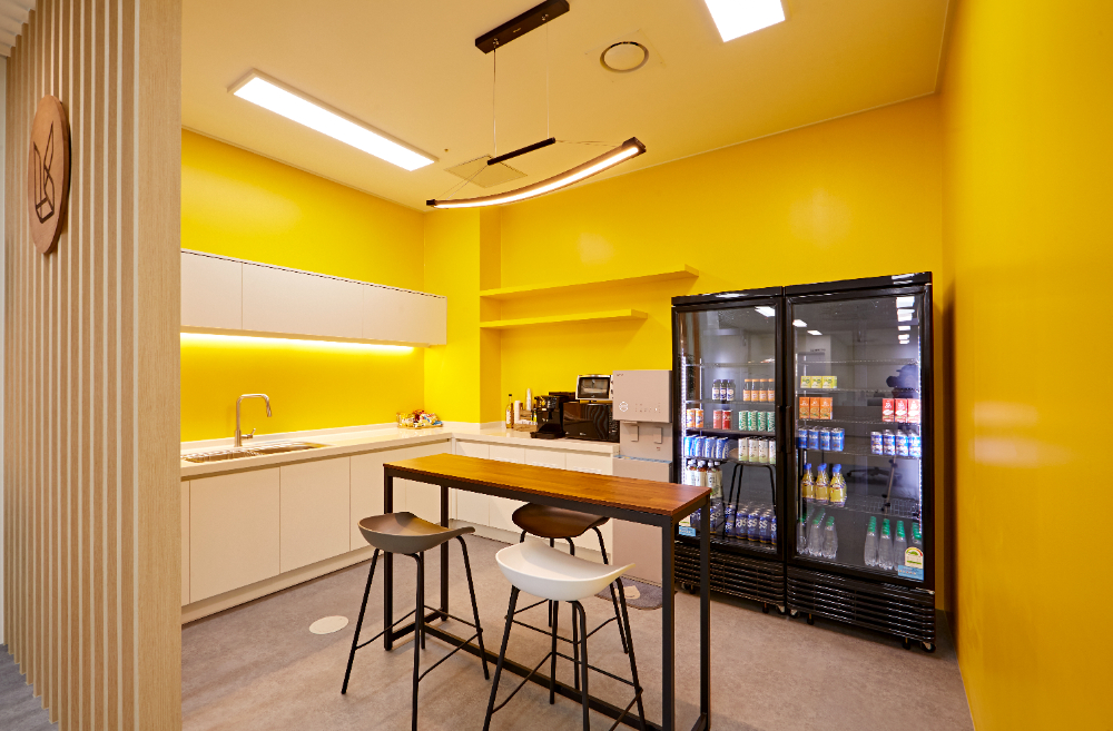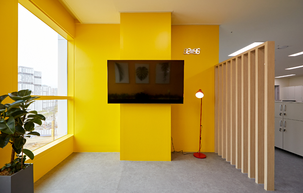 이 곳은 직원들이 잠깐 쉬어갈 수 있는 곳이기도 하고, 손님들이 기다리실 수 있는 곳이기도 한데요. 카페테리아 휴게실과는 또 다른 분위기를 풍기지만, 노란색 벽으로 통일하여 휴게 공간임을 명확히 나타내었습니다.