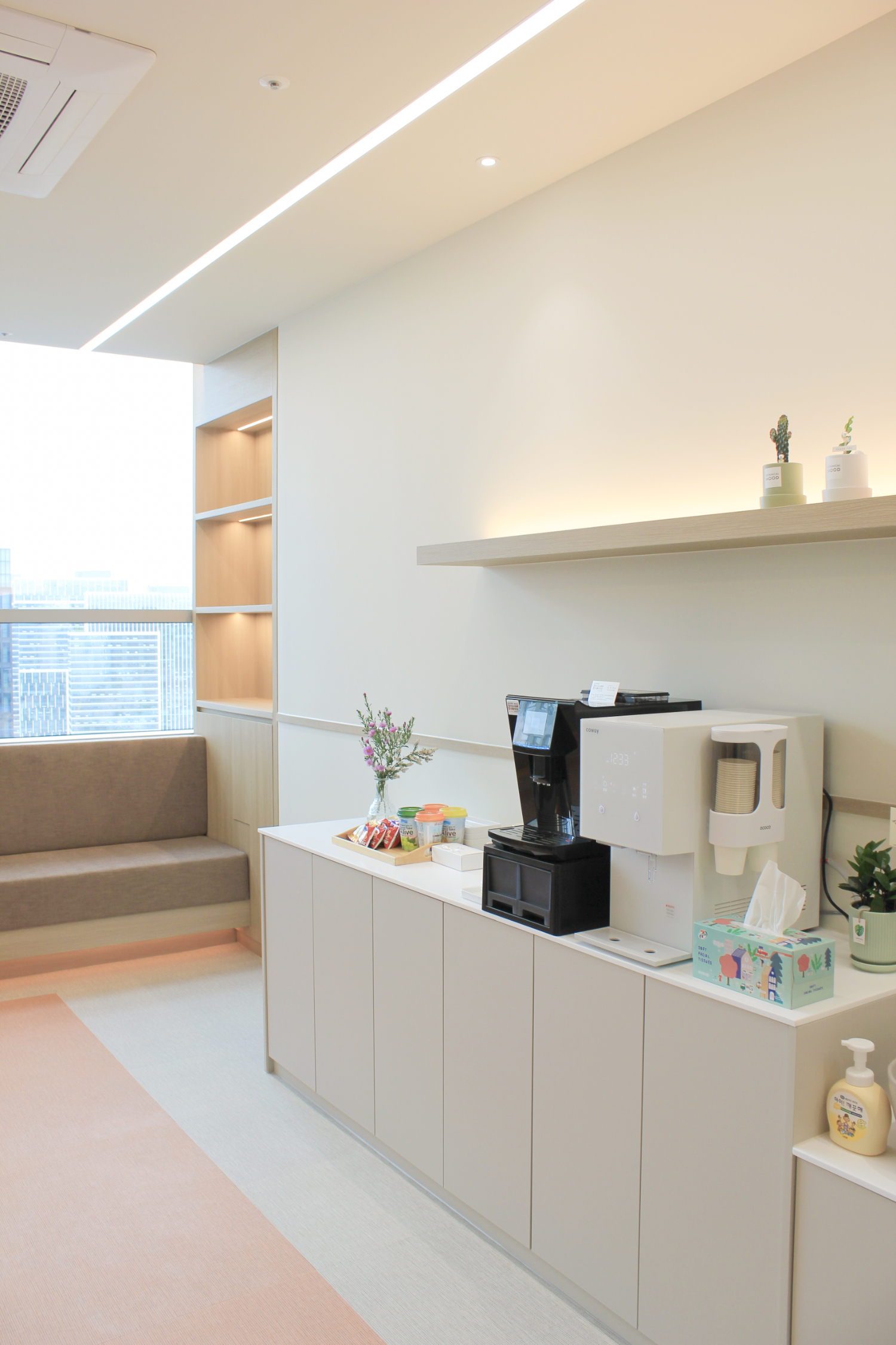 먼저 입구 파사드입니다. 파사드 인테리어도 전체적인 컨셉에 맞춰 화이트&우드로 시공해 편안한 분위기를 연출 했습니다. 출입문은 자동문으로 설치해 편리함을 높였고, 문에는 그라데이션 시트 작업으로 개방감과 프라이빗함을 모두 잡았습니다.
