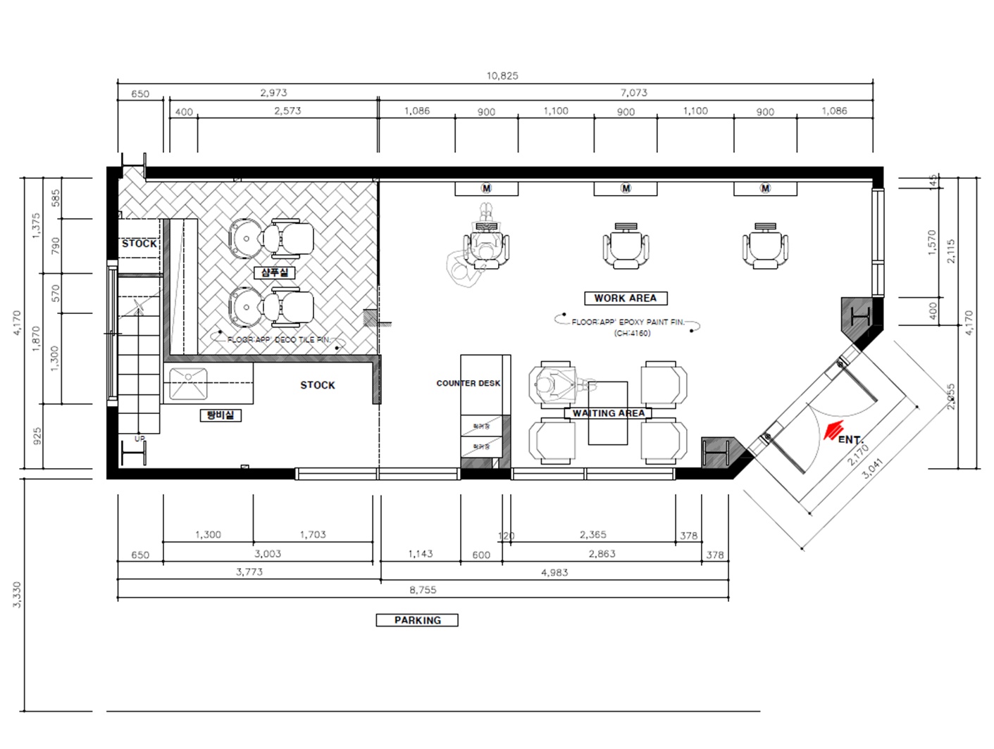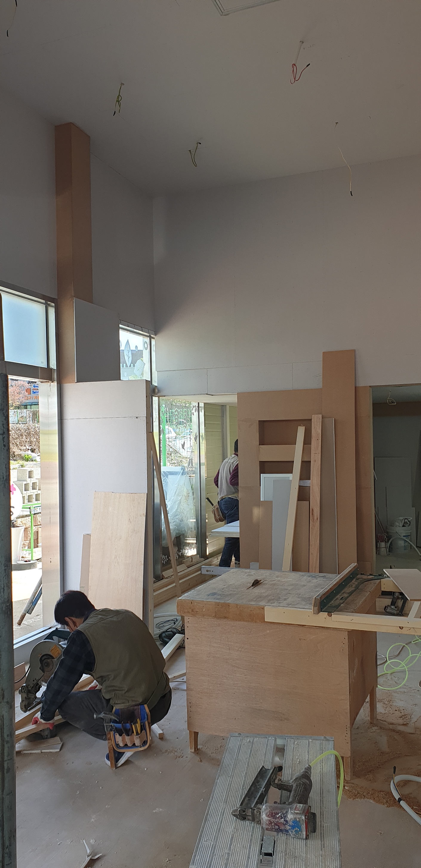 이번 광주상가인테리어에서는 수납공간을 벽면 중심으로 배치해 작업 도구가 깔끔하게 정리되도록 설계했습니다.