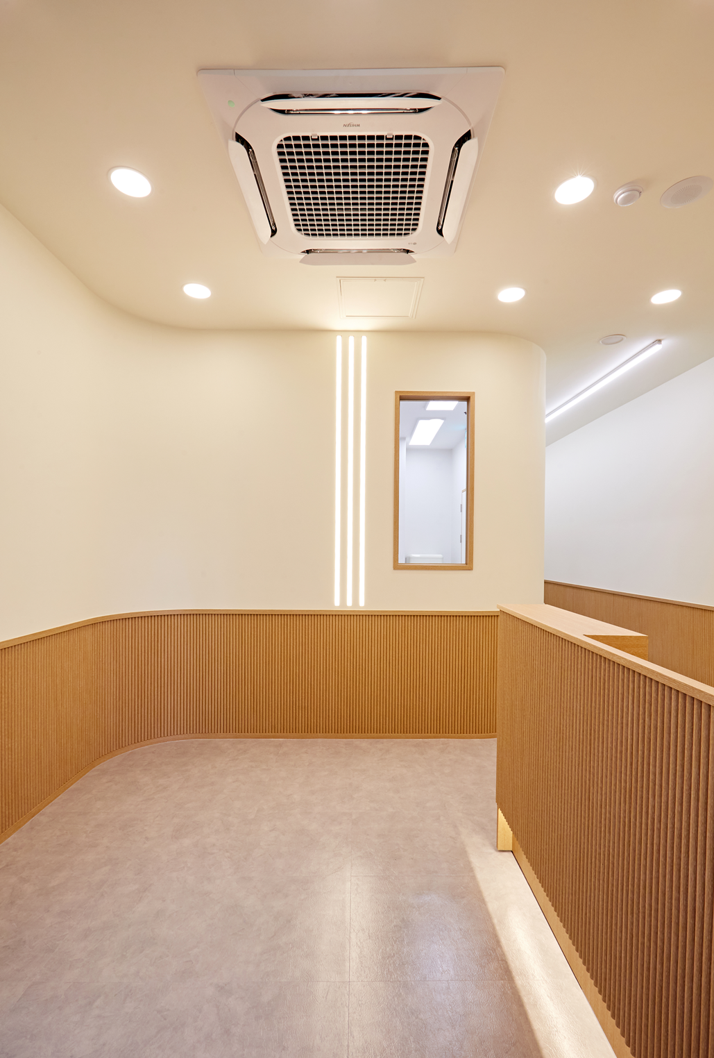 아이보리톤의 벽과 우드 하부 마감의 조화는 단순히 따뜻함을 주는 것뿐만 아니라, 시각적으로 안정적인 비례감을 줍니다