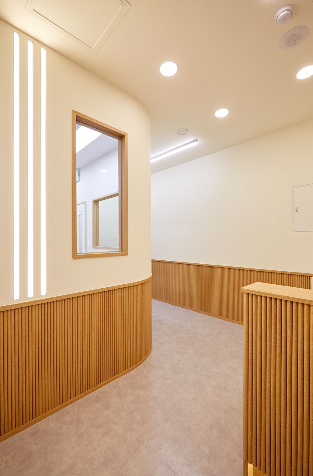 복도와 공용 공간은 부드러운 곡선 벽면과 우드 텍스처를 적용하여 아늑하게 연출하였습니다. 벽과 바닥, 천장 컬러는 전체적으로 아이보리 톤을 유지하면섣 우드 포인트를 곳곳에 배치해 통일감을 유지했습니다. 이렇게 설계함으로써 학생들이 이동 중에도 시각적 피로를 최소화하고 편안함을 느낄 수 있도록 하였습니다.
