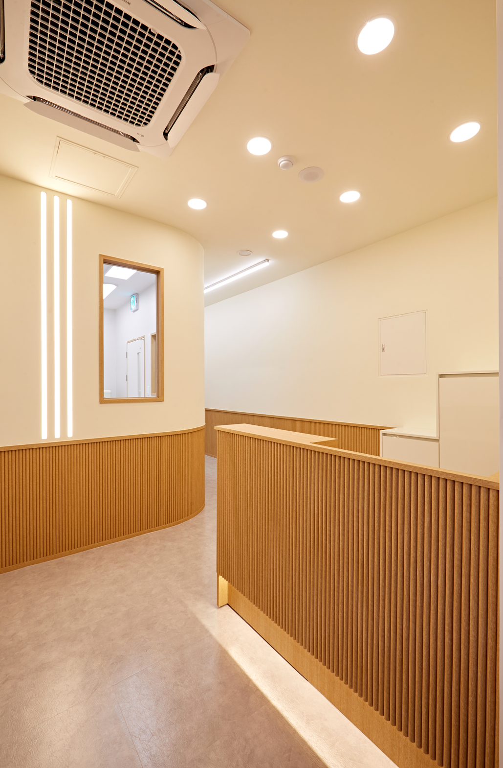 리셉션 데스크와 복도 주변에도 목공 작업이 이루어졌습니다. 학원의 밝고 따뜻한 분위기와 조화를 이루도록