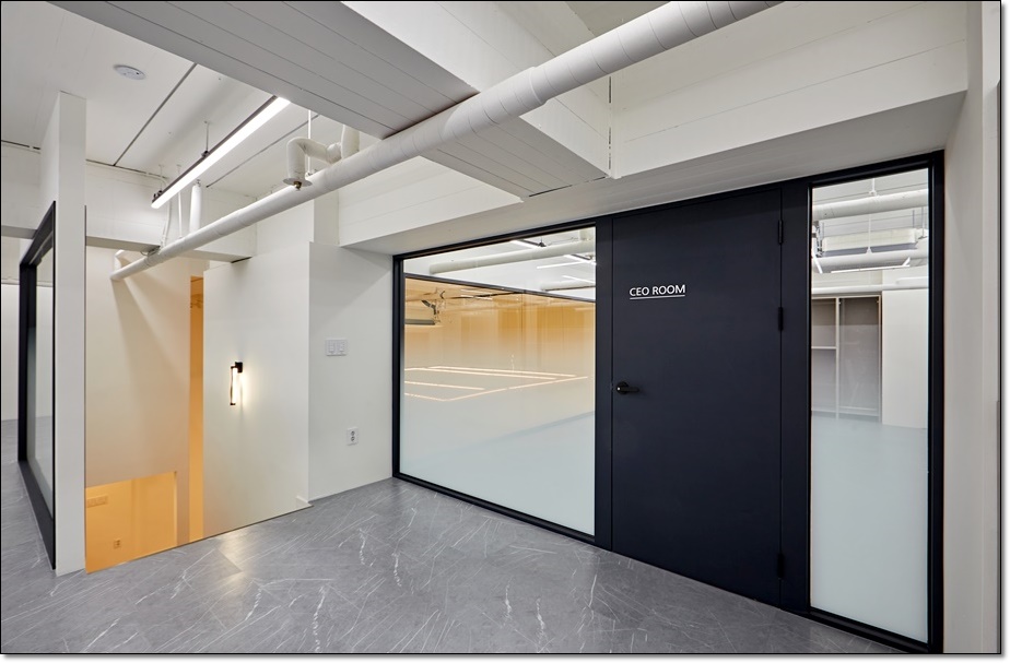 방화문 안쪽에는 미스트 유리 도어를 적용해 개방감을 주면서 시선을 분산해 직접적인 노출은 차단했고 내부의 밝은 인테리어를 외부 익스테리어로 활용할 수 있도록 했죠. 광주 첨단 프라임비즈파크 비즈밸리 사무실인테리어를 계획하실 때도 익스테리어와 인테리어를 함께 진행하신다면 좋은 효과를 기대하실 수 있을겁니다.