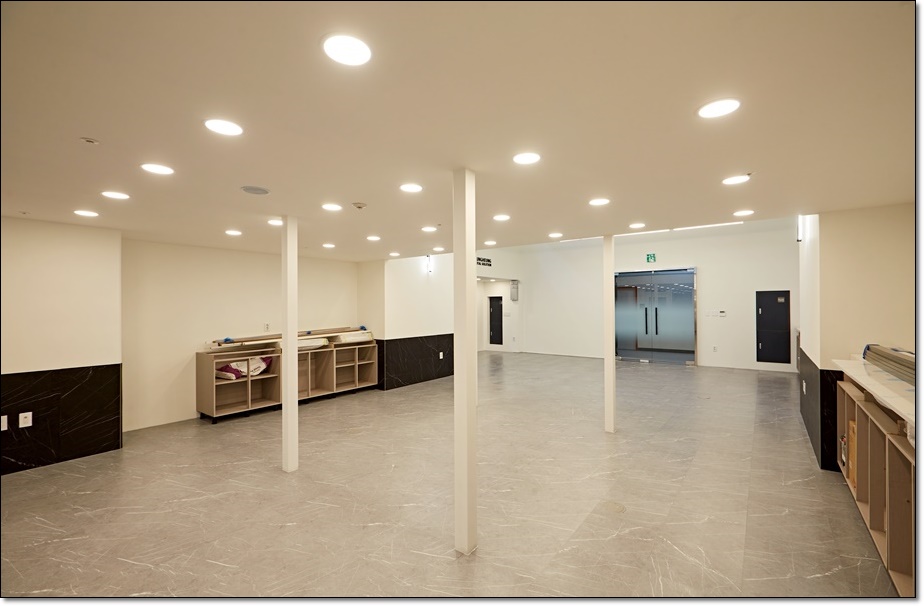 바닥은 연한 그레이톤 타일로 마감해 공간에 안정성을 주면서 내구성을 높였고 단층 천장에는 라인조명을 복층 하부에는 매입형조명 등을 구성해 적절한 조도를 확보할 수 있도록 했습니다. 단층부는 로비공간으로 두고 복층 하부와 발코니는 휴게실로 조성했으며 또다른 구조를 만들어 쇼룸으로 사용할 수 있도록 했습니다.