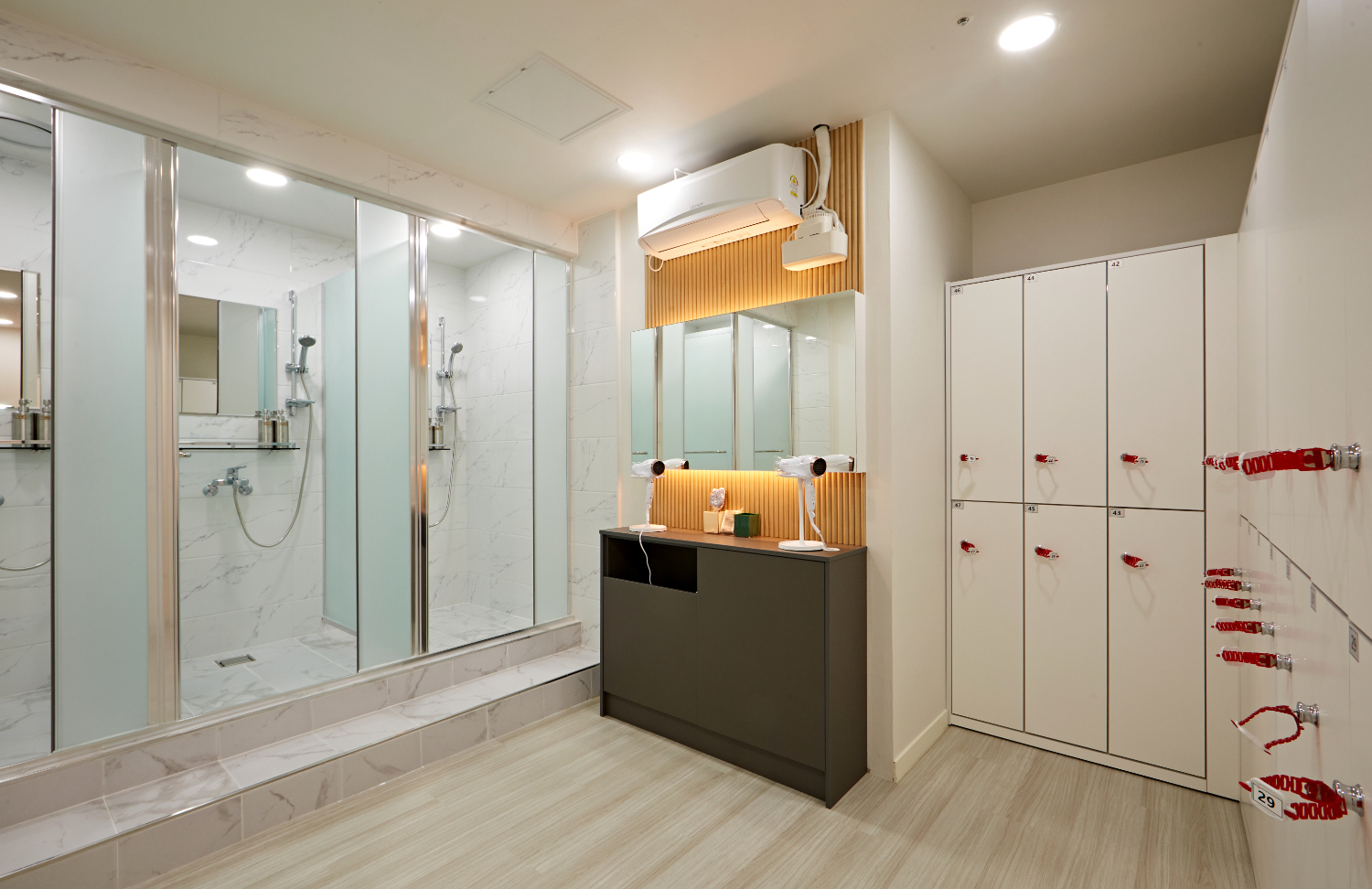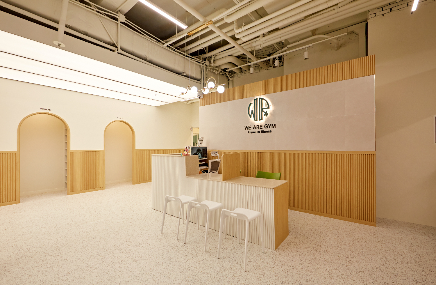 템바보드 디자인을 활용하고 곡선으로 마감한 카운터는 따뜻하면서도 클래식한 느낌을 주고 있습니다. 곳곳에 우드 포인트가 함께 가미되었으며 테라조 스타일의 바닥 또한 전체적으로 어우러지는 느낌을 주는데요. 그리고 카운터 옆에는 헬스장에서 입을 체육복과 수건이 마련되어 있고 바로 옆에 탈의실이기에 매우 편리한 동선을 자랑합니다.