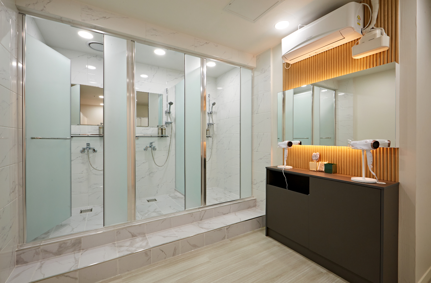 내부는 역시 화사한 모습을 가지고 있고 하얀색 대리석과 각자 나뉘어져있는 샤워실이 인상적입니다. 프라이빗함을 추구하기 위해서 별도의 칸으로 제작하였으며 캐비넷또한 화이트로 통일하였습니다.