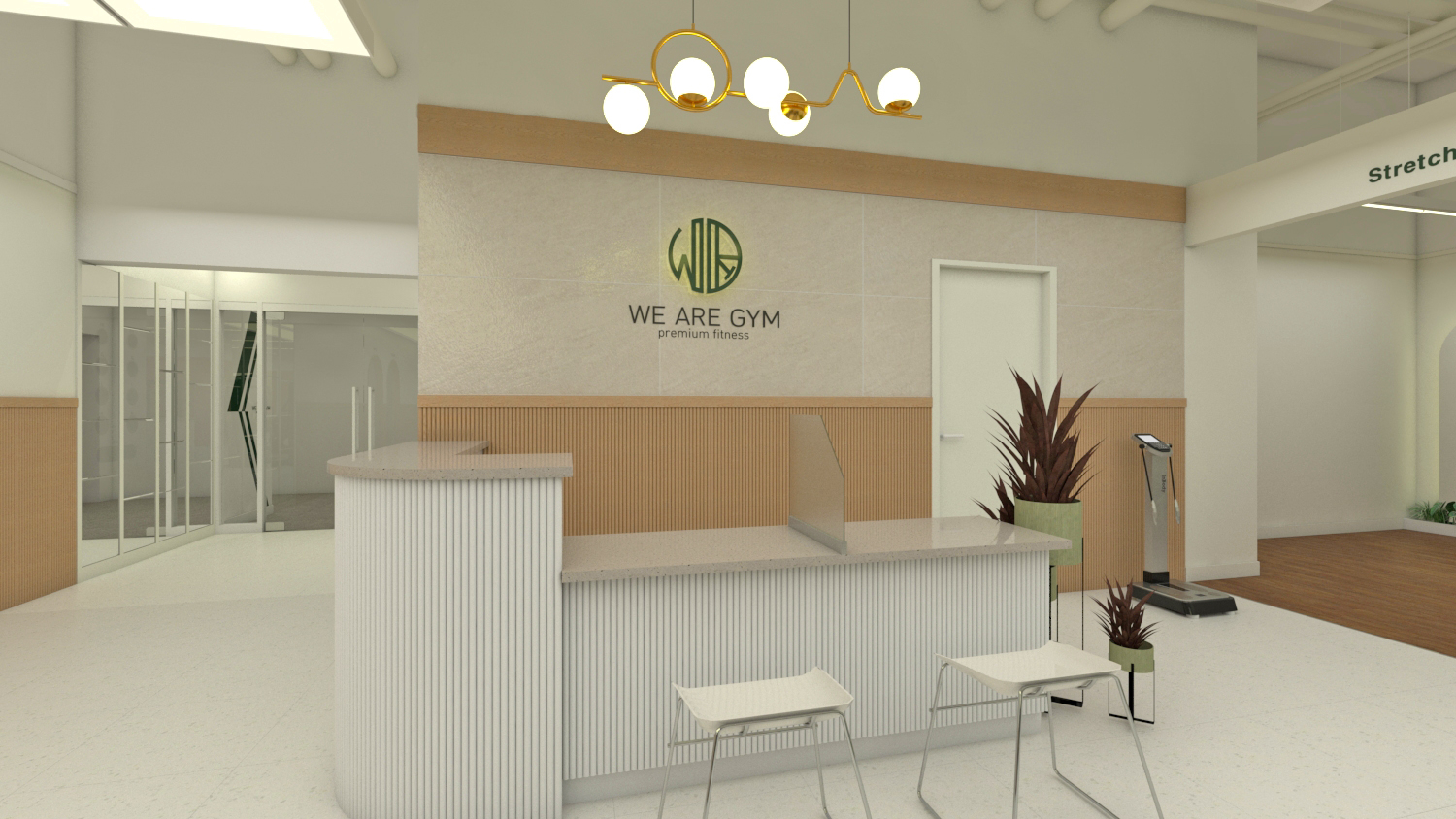 광진구 군자동 헬스장인테리어의 외관 모습입니다. WE ARE GYM이라는 로고가 멋스럽게 천장과 벽면에 부착되어 있으며 녹색의 사선 로고가 균형을 잡아주는데요. 깔끔하면서도 군더더기 없는 미니멀함을 추구하고 있으며 내부가 막힘 없이 보이도록 설계하였습니다.