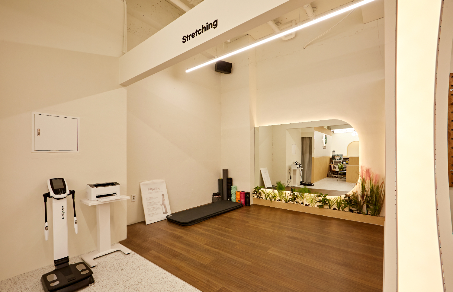 스트레칭존의 오른쪽은 반원처럼 안쪽으로 타공하여서 조명을 부착하였는데요. 평범하지 않은 조형물이기 때문에 더욱 포인트가 되고 있으며 이곳의 로고도 원형인만큼 곳곳에 아치형태의 문이나 이러한 포인트로 부드러움을 주며 통일성을 맞추기 위해 노력했습니다.