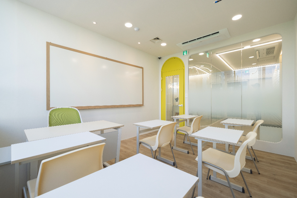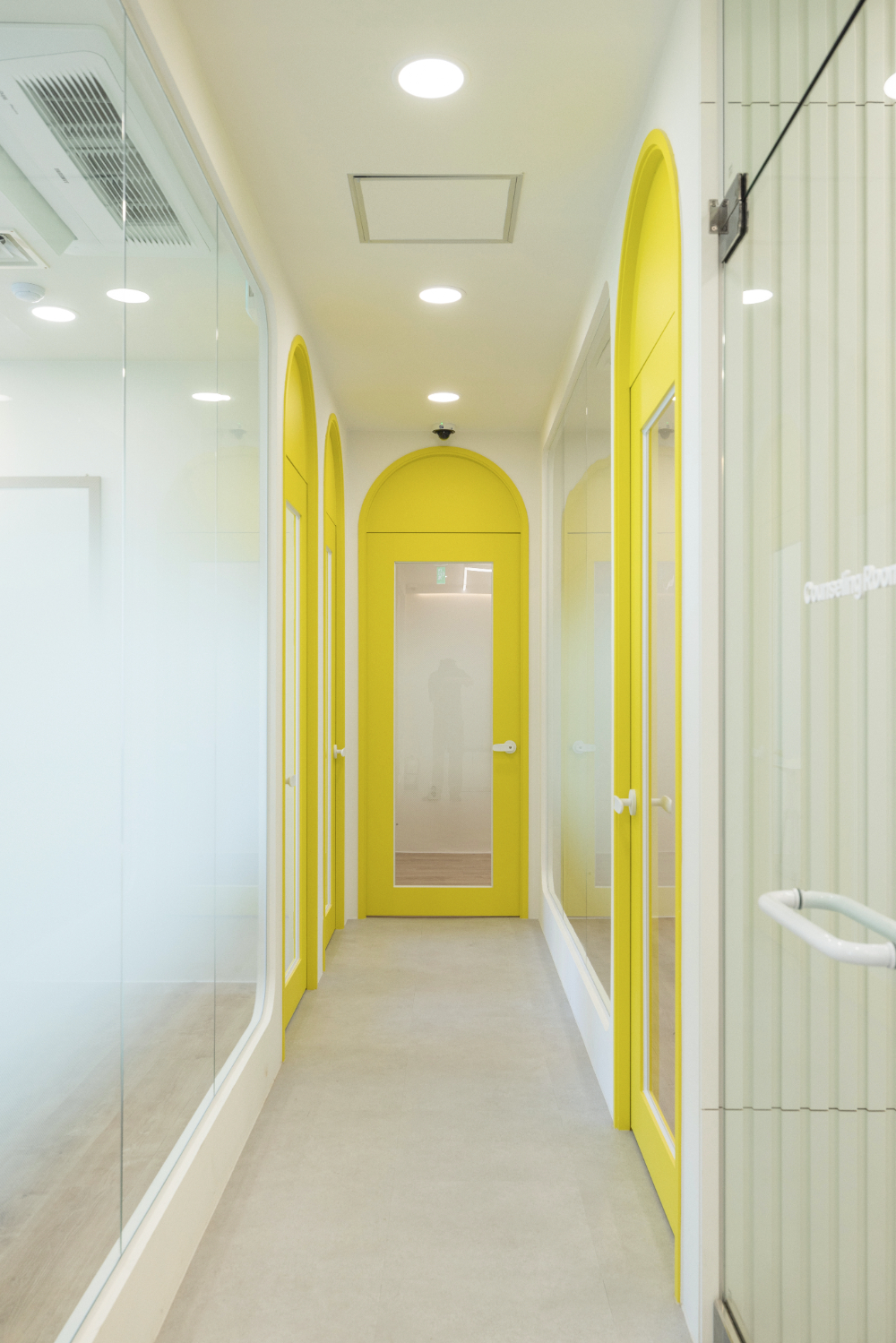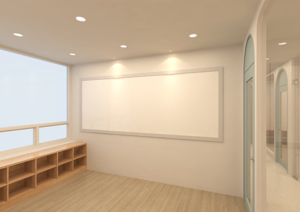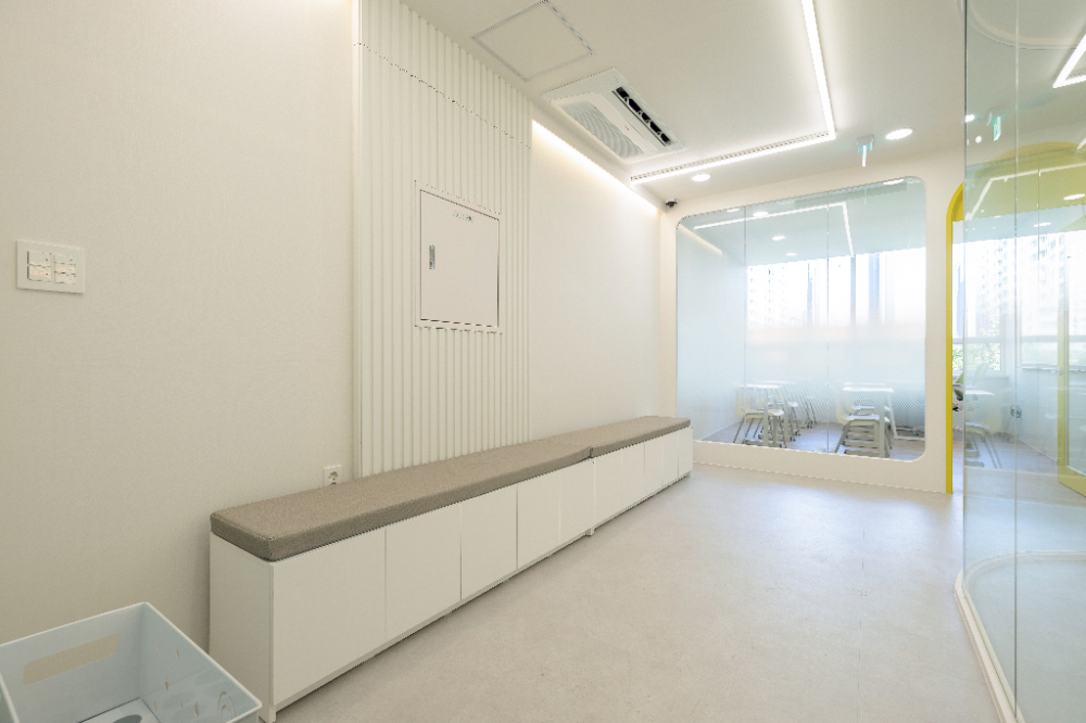 내부를 전체적으로 둘러보시면 미니멀한 마감으로 화이트 인테리어가 완성된 것을 알 수 있습니다. 그리고 원래 계획했던바와 달라진 부분이 하나 있다면 도어의 색상이 민트에서 노란색으로 변경된 것인데요. 계속된 소통끝에 학원이 타겟팅하는 아이들의 연령대에 맞춰 어울리는 밝은 색감으로 바꾸게 되었습니다.