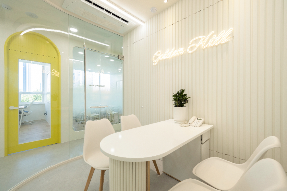 그리고 옐로우 도어의 유리는 모루유리로 시공하여서 디테일을 살렸으며, 교실 옆면에 글라스월로 된 곳에는 중앙에 불투명 시트지를 부착하여 시야를 제한하였습니다. 이처럼 곳곳에 가벽으로 공간을 분리하면서도 유리로 시공하여 적절한 조화를 두었습니다.