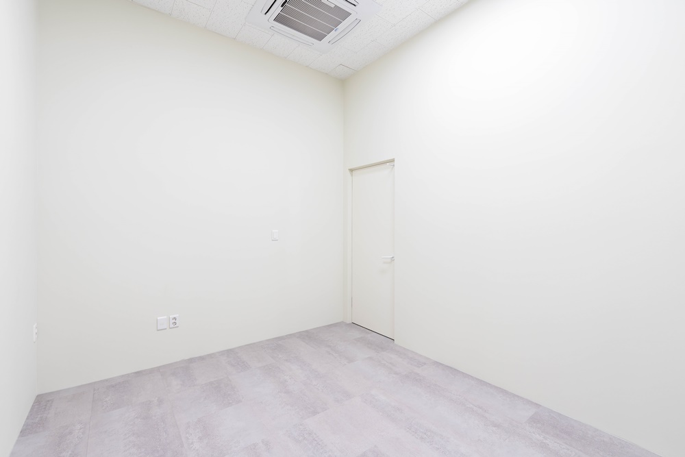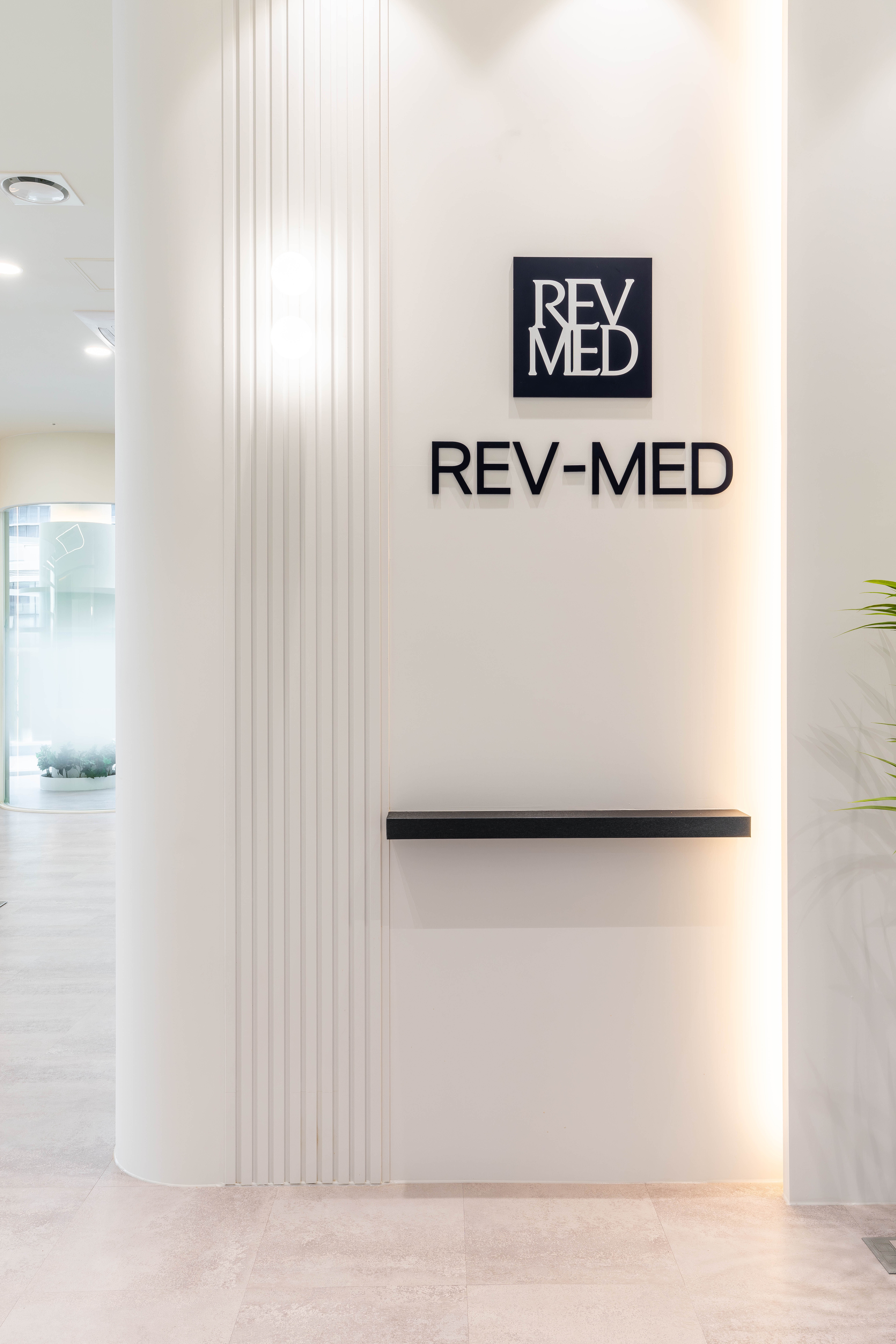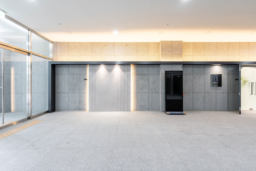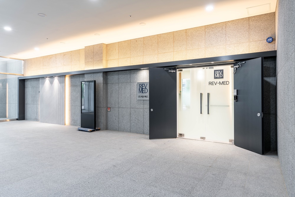 입구에 위치한 'REV-MED' 로고 월은 미니멀한 화이트 배경에 블랙 레터링을 더해 기업의 아이덴티티가 명확히 드러나도록 설계했답니다.