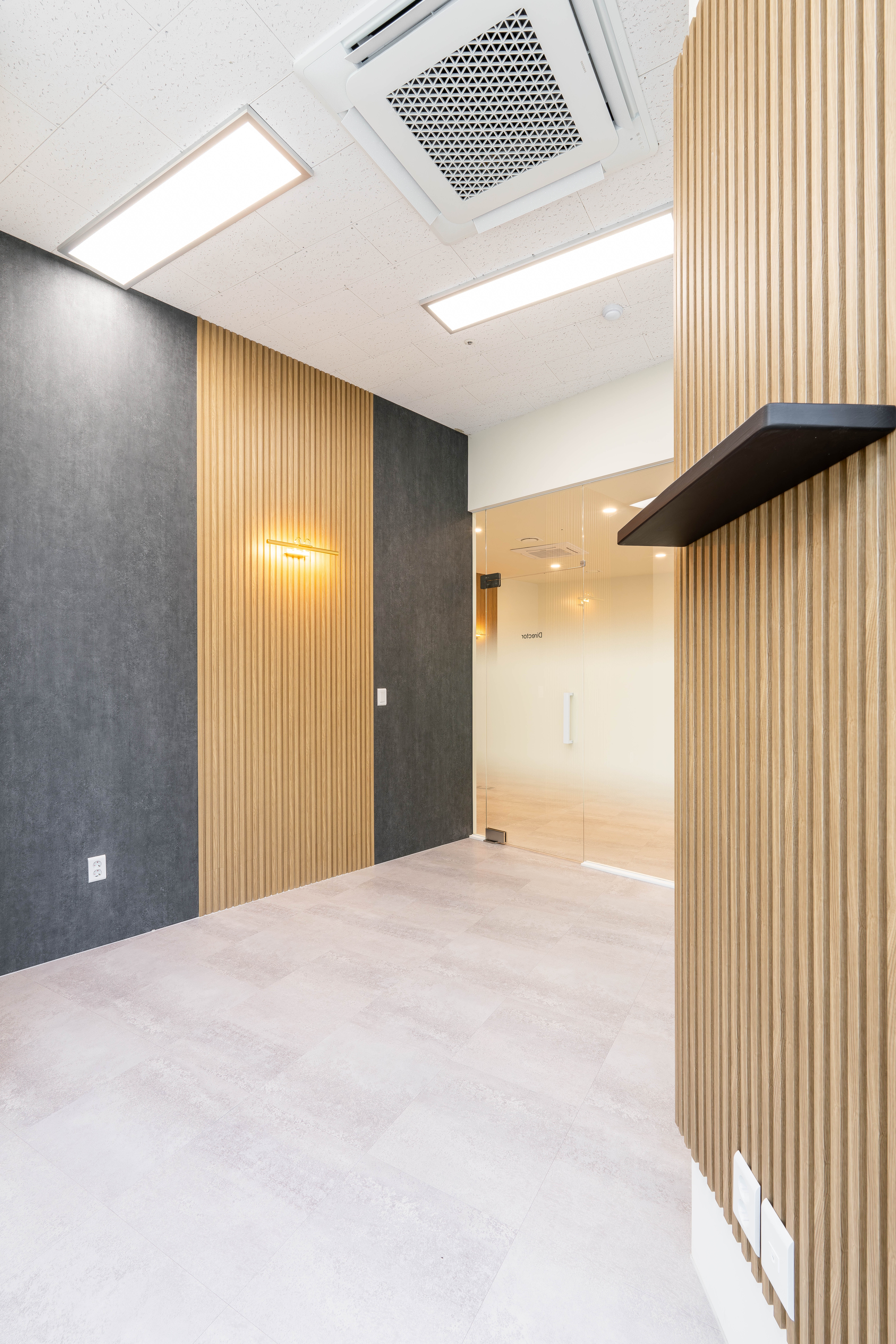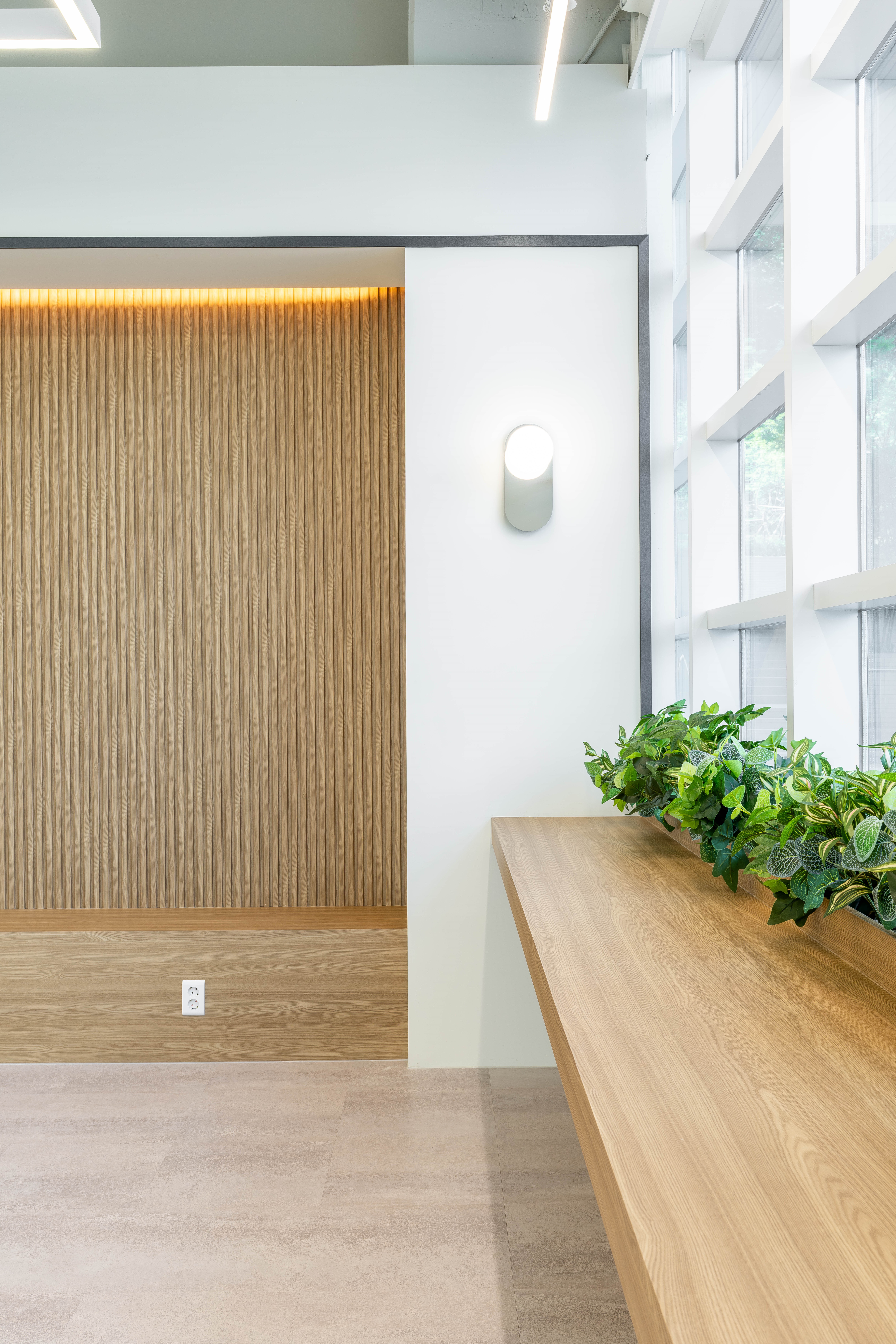 가장 먼저 시선을 사로잡는 로비 공간은 방문객에게 신뢰를 줄 수 있도록 무게감 있는 우드 템바보드를 메인 소재로 활용했는데요.