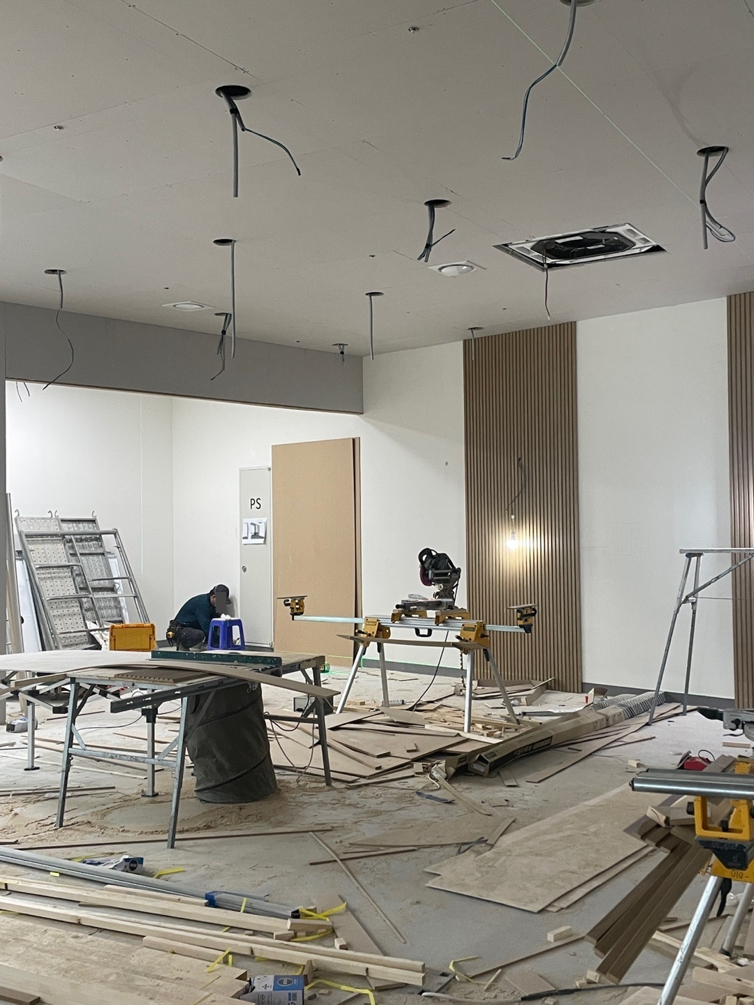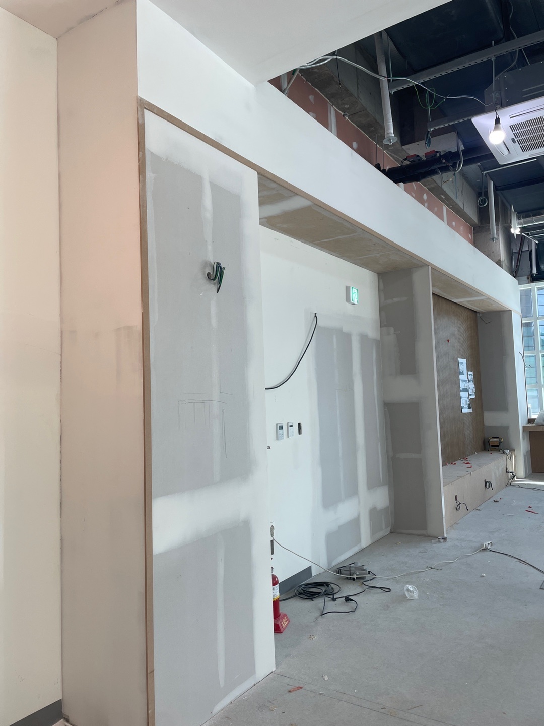 로비에서 회의실로 이어지는 복도 구간은 라인 조명을 매립하여 공간이 더 길고 넓어 보이도록 유도하며, 원스톱 맞춤 설계의 디테일을 현장에서 하나하나 구현해 나갔답니다.