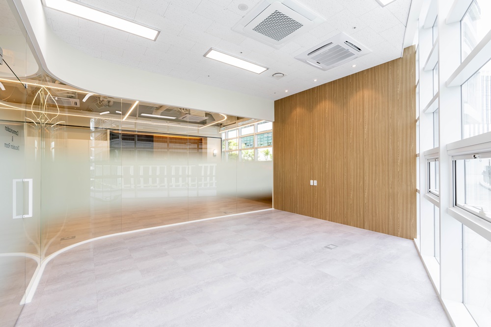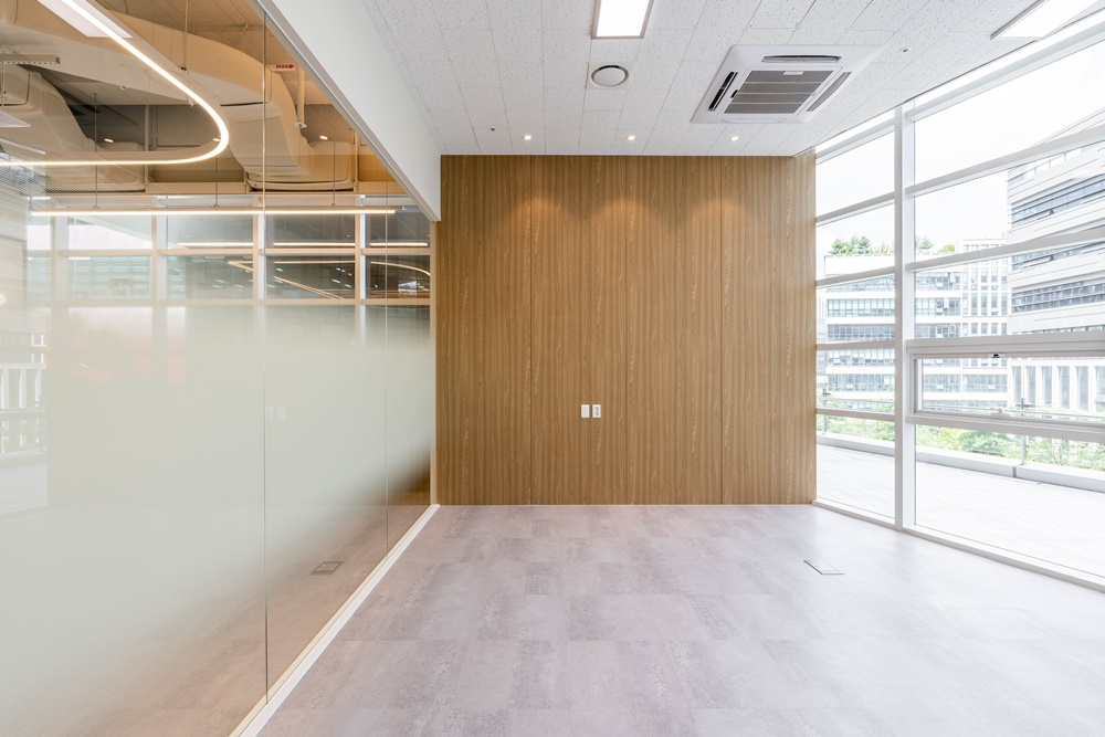 대형 오피스에서 흔히 발생하는 답답함을 해소하기 위해 벽면 전체를 답답한 가벽 대신 투명한 유리 파티션으로 설계하여 시각적 개방감을 극대화했답니다.
