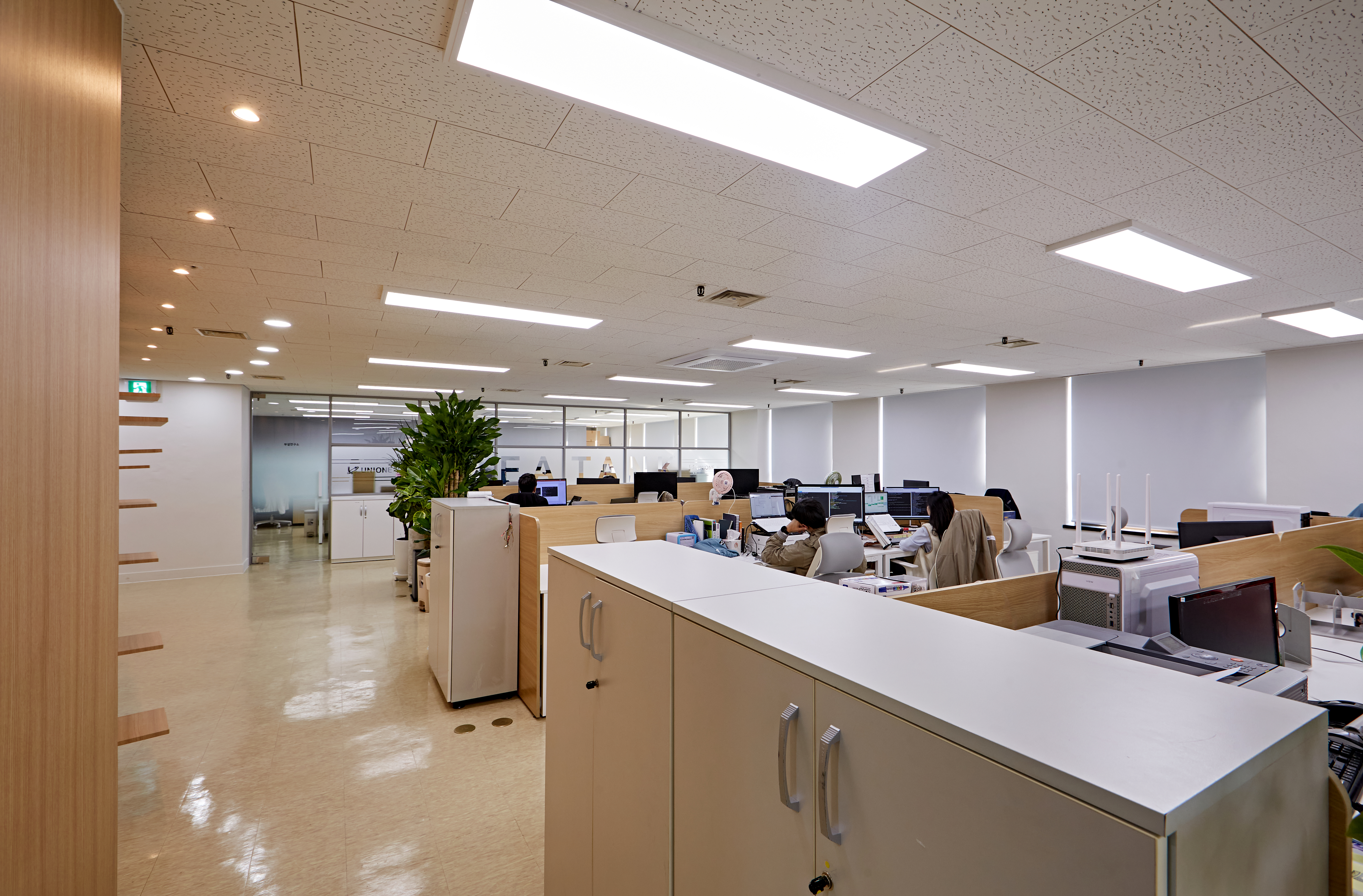 사무공간은 밝은 LED 천장 조명과