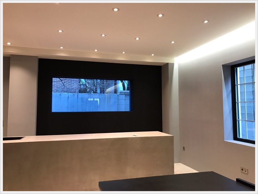 한쪽 벽면 위쪽에 등박스가 공간을 화려하게 비춰주고 있으며 천장 가득 원형 매입형 간접조명이 모던한 공간을 화사하게 만들어 주고 있습니다. 그로 인해 예쁜 멋진 공간으로 완성된 모습 확인해 보실 수 있습니다.