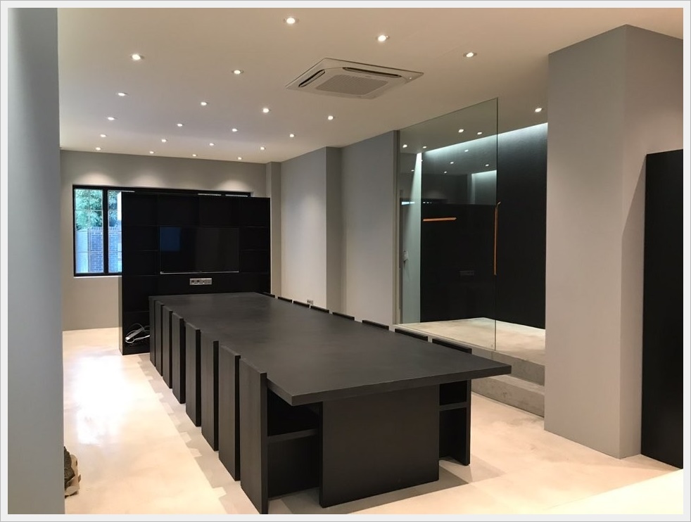 다음으로는 공용 공간으로 한쪽 벽면에 등박스가 설치되어 있으며 천장에는 원형매입등으로만 채워 화사함을 높여 드렸습니다. 거기에 앞쪽 부분에는 멀티미디어를 활용할 수 있는 아이템을 넣어 실용적인 측면을 높여 드렸으며 가운데 깔끔한 디자인의 짙은 컬러의 테이블과 의자를 놓아 공간을 채웠습니다.