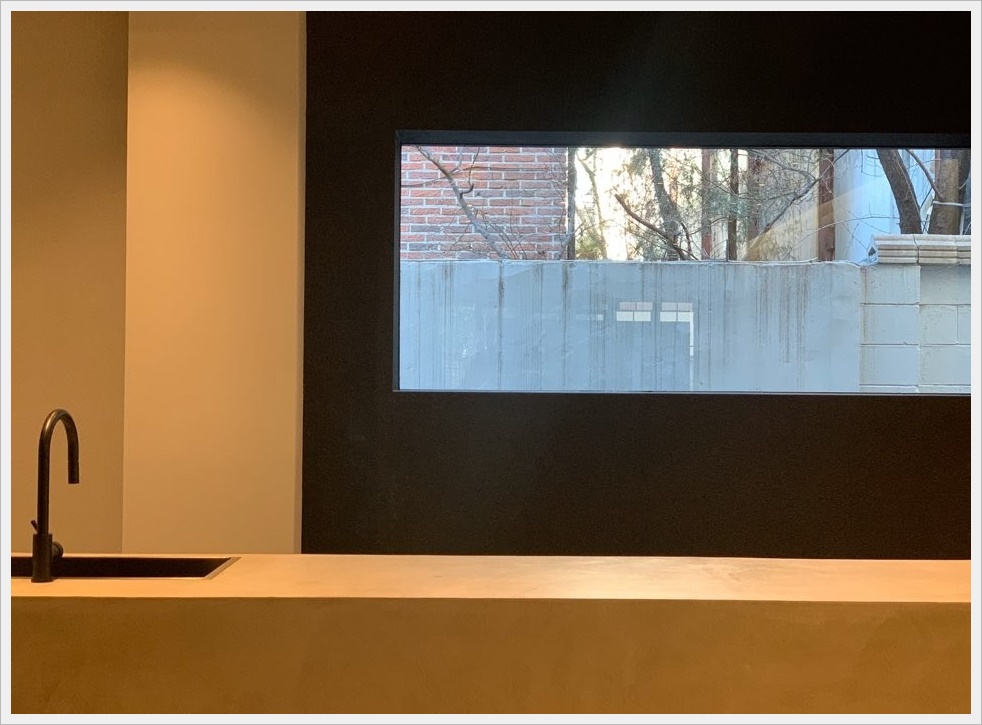 싱크대 뒤쪽에는 바깥쪽 부분이 보이도록 타공을 하여 마치 액자 같은 느낌을 만나 볼 수 있도록 설계하였습니다. 깔끔한 디자인에 어두운 컬러로 진행하여 바깥쪽 공간이 더욱더 돋보일 수 있도록 디자인하였으며 완성도 높게 시공이 된 모습 확인해 보실 수 있습니다.