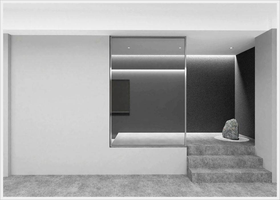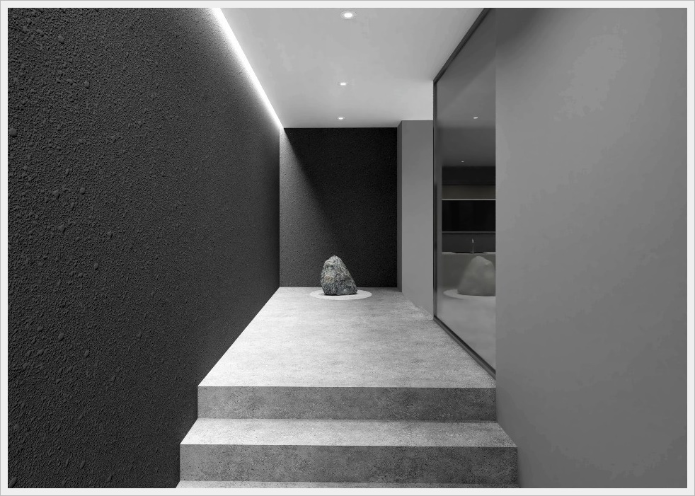 공용공간으로 사용될 곳으로 한쪽 벽면에 라인을 따라 간접조명을 설계하여 무게감 있는 공간에 화사함을 더해주고 있습니다. 바닥 역시 앞서 보신 질감이 느껴지는 타일을 이어 설계하여 통일감 있는 느낌을 보여주고 있습니다.