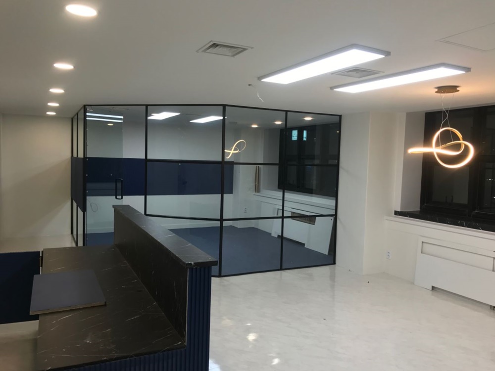 이 현장은 천장은 있는 그대로를 활용하기를 요청하셔서 조명만 교체하고 도장을 새로 칠하기로 했습니다. 천장 작업을 마무리한 후 공간을 구분하는 가벽 작업을 진행했는데요, 면적이 좁은 사무실이어서 합판 대신 유리 가벽을 시공하기로 했고 이를 위해 금속 프레임을 설치했습니다.