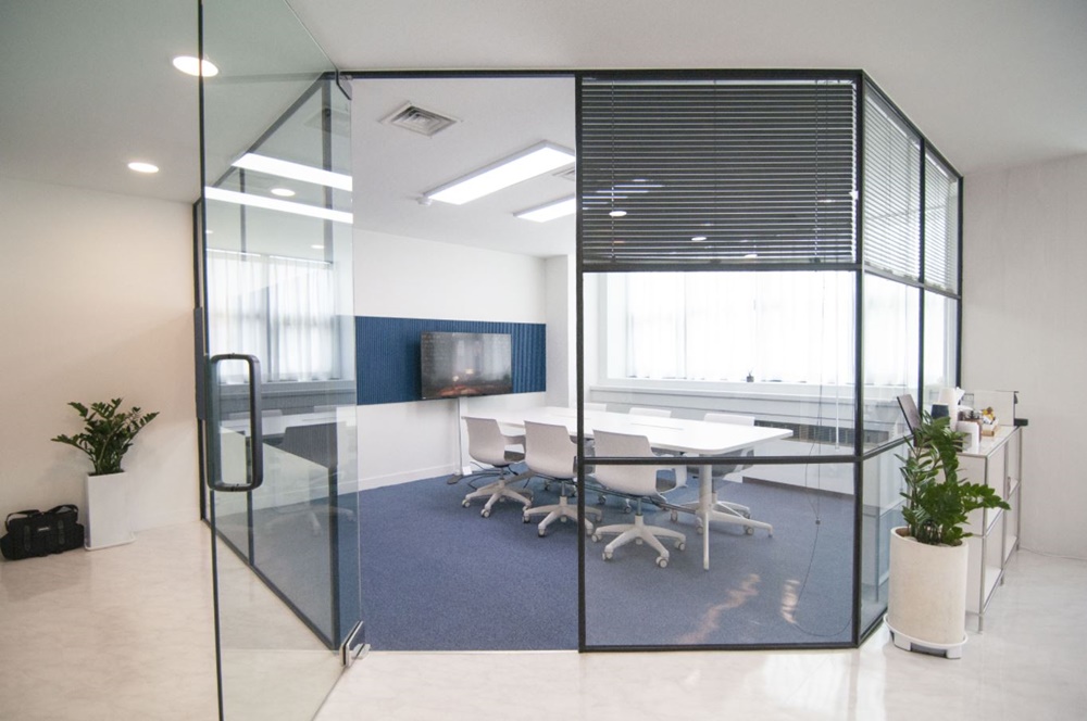 입구측에 시공된 회의실입니다. 회의실을 입구측에 계획하면 방문객 동선을 제한할 수 있어 기업 보안에도 큰 도움이 되고 동선을 절약할 수 있다는 장점이 있습니다. 그러나 공간을 분리하기 위해 합판 가벽을 시공하면 공간이 답답해보일 수 있으므로 유리 가벽으로 시공하되 프레임 디자인을 적용해 심플하면서 세련된 공간으로 만들었습니다.