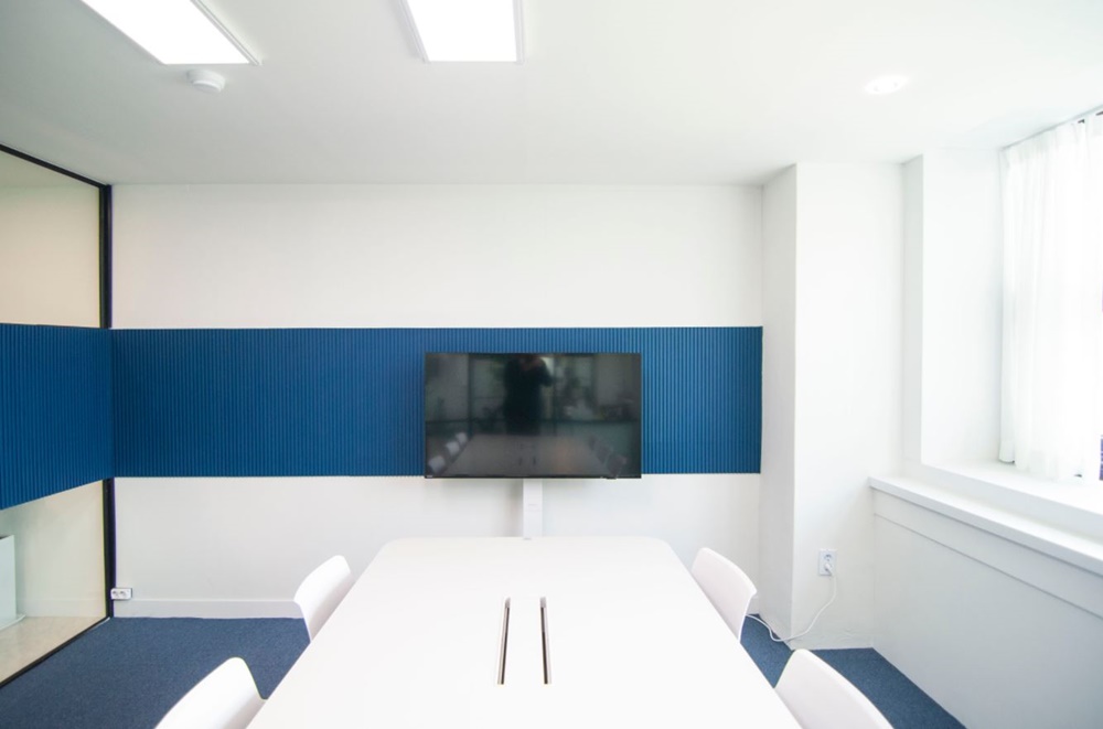 입구측에 배치된 회의실은 유리 가벽에 알판 작업을 한 후 템바보드를 시공해 직접적인 노출을 차단하면서 내부 파사드로 활용할 수 있도록 해드렸고 같은 높이로 벽면을 따라 템바보드를 시공해 디자인적 통일감을 부여했습니다.