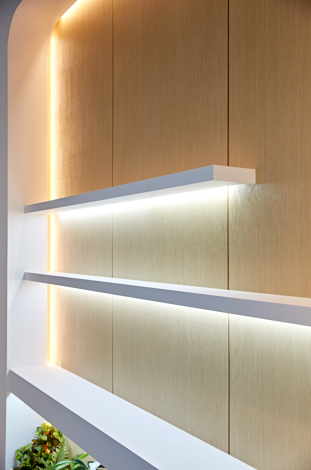 사무실 내부로 이어지는 복도 공간에는 우드 템바보드와 선반, 간접조명, 조화 디스플레이, 싸인 로고로 포인트를 주었는데요. 다수의 포인트 요소들이 사용 되었음에도 컬러 톤을 맞춰 복잡하지 않고 심플하게 연출 되었습니다.